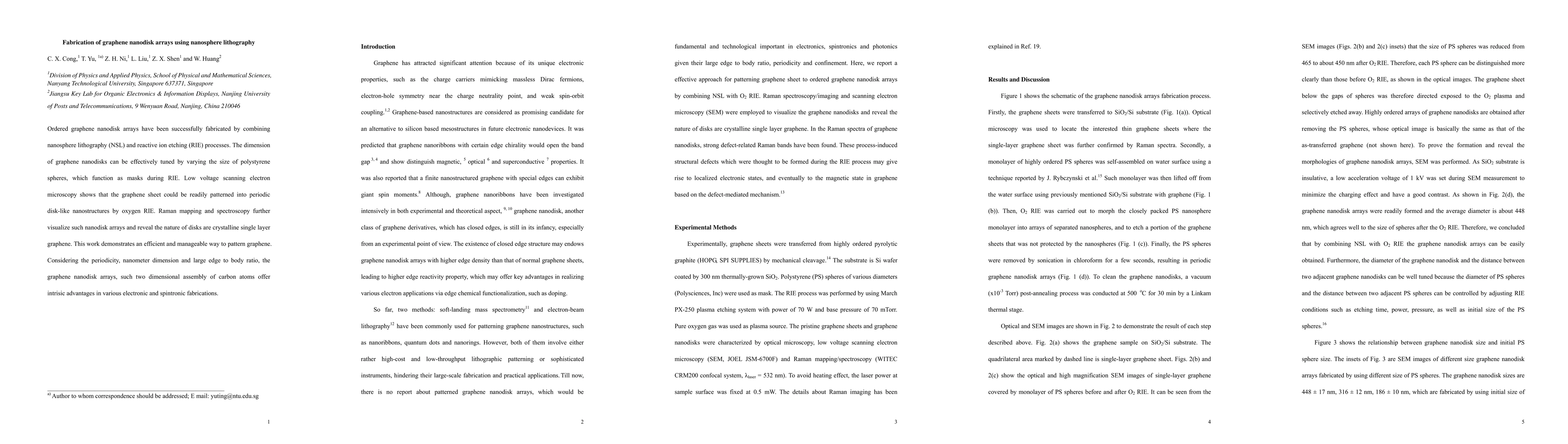 This paper details the fabrication of ordered graphene nanodisk arrays using nanosphere lithography and reactive ion etching, with tunable dimensions based on the size of the polystyrene spheres used as masks. The study shows the potential of these structures for applications in electronics and spintronics due to their periodicity and nanometer dimensions.