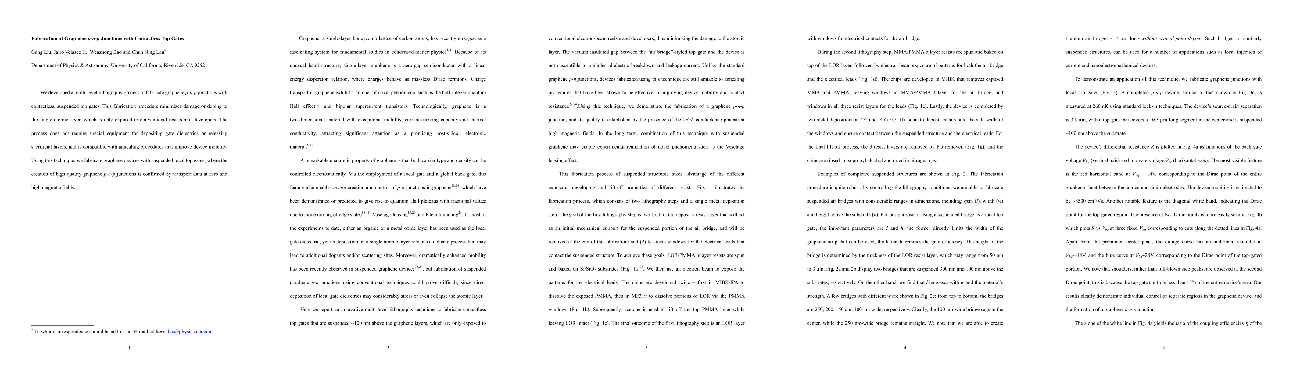 This research presents a multi-level lithography method to create high-quality graphene p-n-p junctions with contactless top gates, minimizing layer damage and maintaining device mobility. The technique confirms junction functionality via transport data under various magnetic fields.