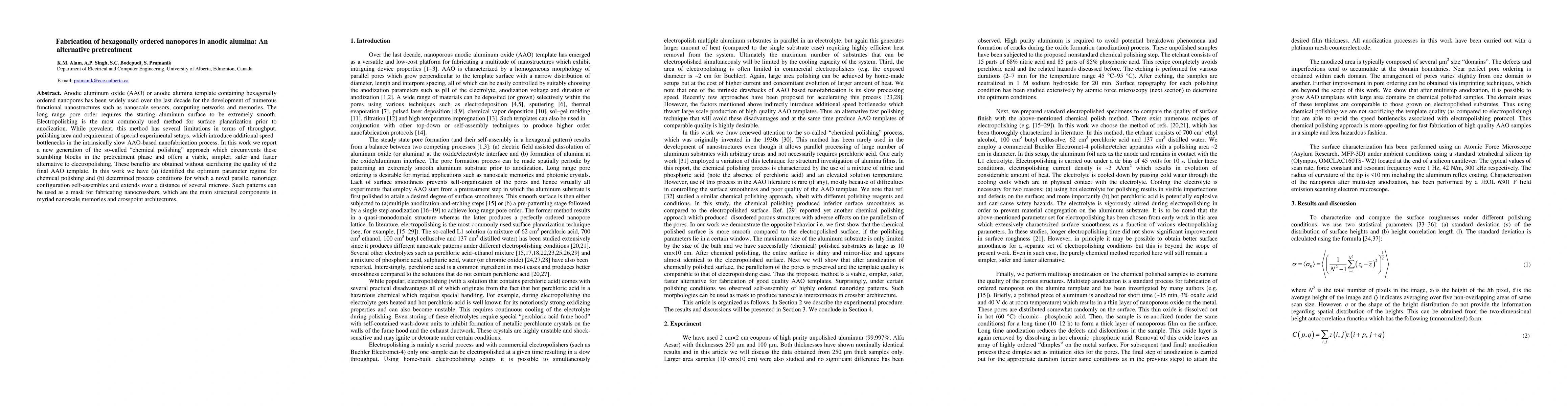 This paper presents a new "chemical polishing" method as an alternative to electropolishing for preparing smooth aluminum surfaces for anodic alumina template fabrication, offering improved throughput, simplicity, and speed without compromising template quality. The study identifies optimal parameters and conditions for creating self-assembled nanoridge patterns useful for nanocrossbar fabrication.