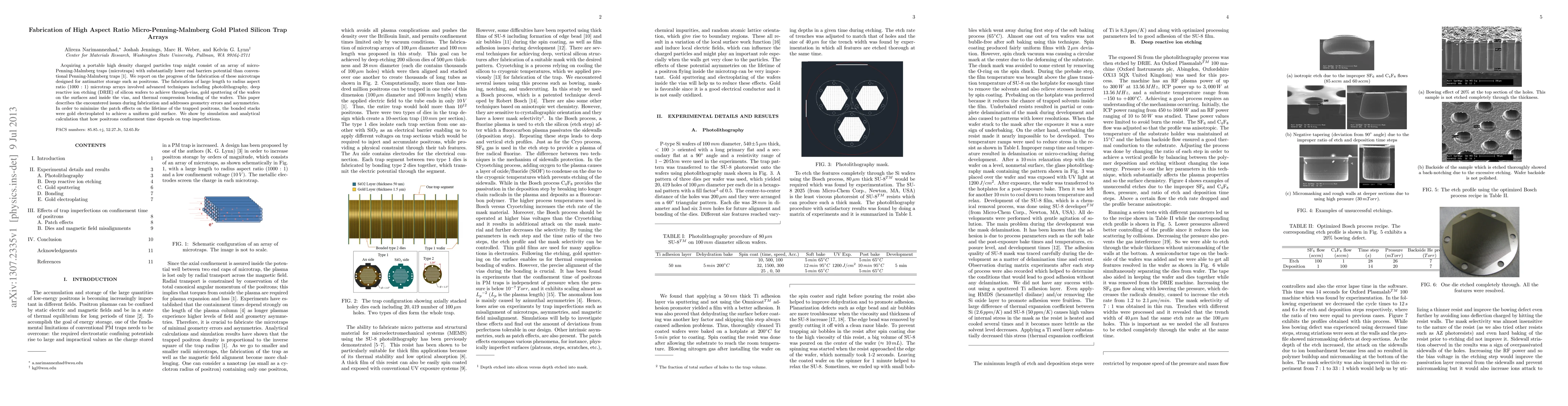 Acquiring a portable high density charged particles trap might consist of an array of micro-Penning-Malmberg traps (microtraps) with substantially lower end barriers potential than conventional Penning-Malmberg traps [1]. We report on the progress of the fabrication of these microtraps designed for antimatter storage such as positrons. The fabrication of large length to radius aspect ratio (1000:1) microtrap arrays involved advanced techniques including photolithography, deep reactive ion etching (DRIE) of silicon wafers to achieve through-vias, gold sputtering of the wafers on the surfaces and inside the vias, and thermal compression bonding of the wafers. This paper describes the encountered issues during fabrication and addresses geometry errors and asymmetries. In order to minimize the patch effects on the lifetime of the trapped positrons, the bonded stacks were gold electroplated to achieve a uniform gold surface. We show by simulation and analytical calculation that how positrons confinement time depends on trap imperfections.