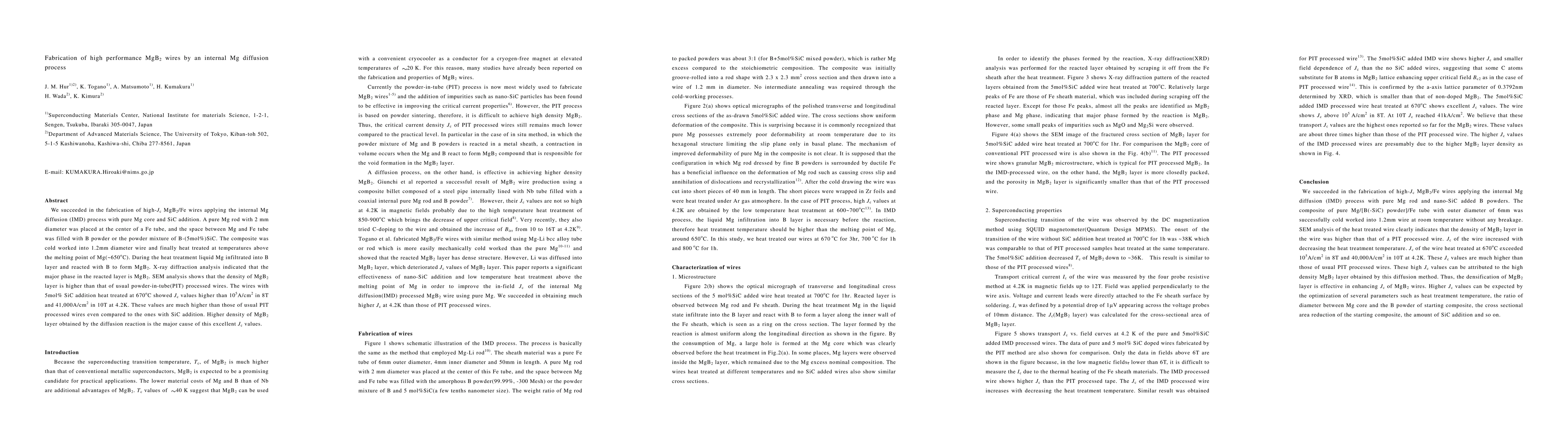 The paper describes the successful fabrication of high-performance MgB2/Fe wires using an internal Mg diffusion process, achieving significantly higher critical current densities (Jc) compared to conventional methods, particularly with the addition of 5 mol% SiC. The process involves placing a pure Mg rod in a Fe tube filled with B or B-SiC powder, cold working into wire form, and heat treatment to form MgB2 with higher density and improved Jc values.