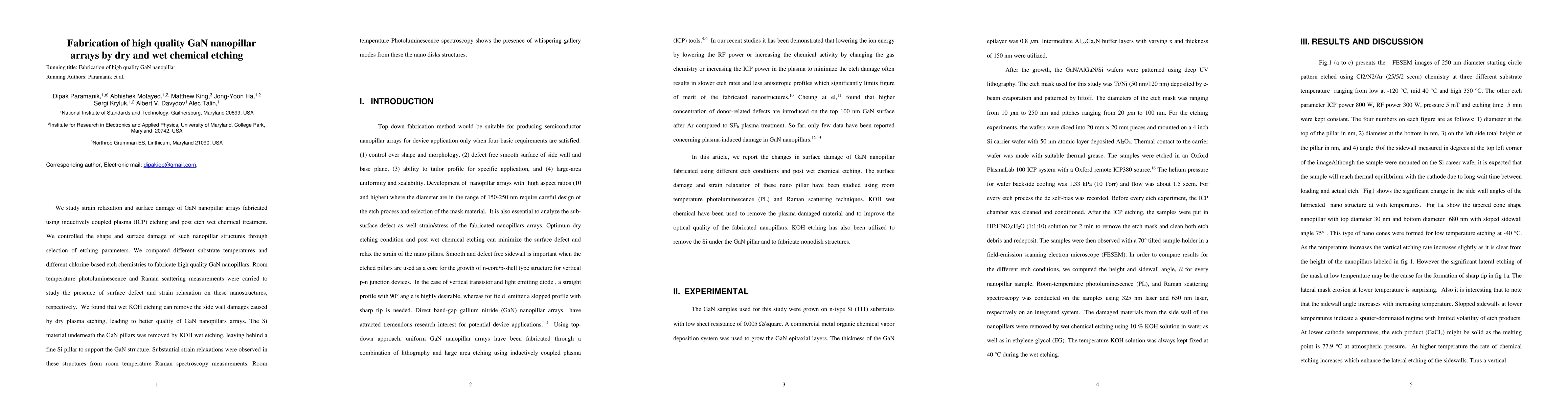 The paper presents a comprehensive study on the fabrication of high-quality GaN nanopillar arrays using a combination of ICP etching and wet chemical treatment with KOH, demonstrating improved optical properties through surface damage removal and strain relaxation.