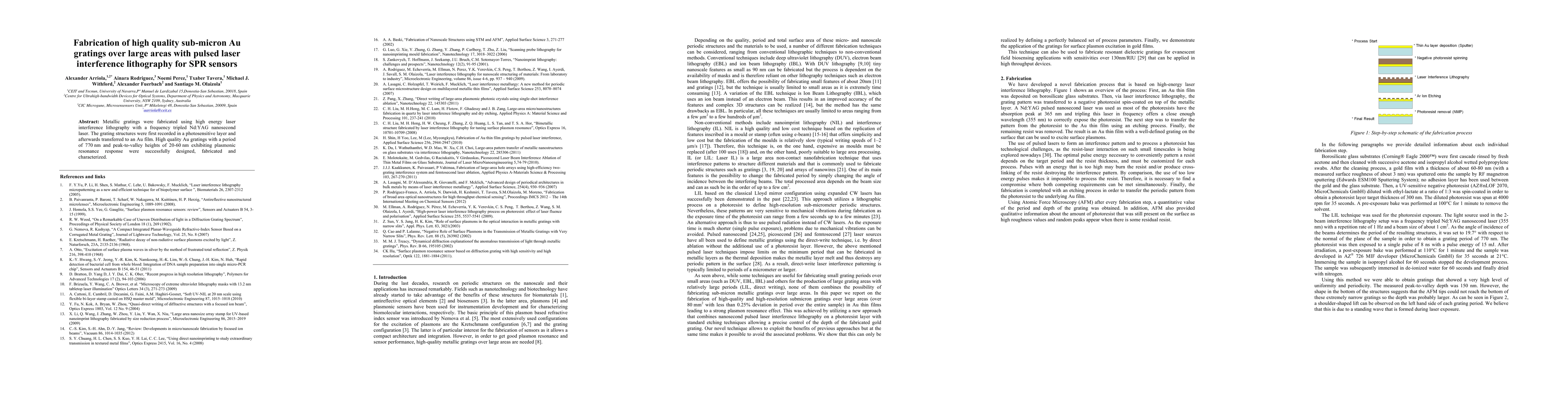 Metallic gratings were fabricated using high energy laser interference lithography with a frequency tripled Nd:YAG nanosecond laser. The grating structures were first recorded in a photosensitive layer and afterwards transferred to an Au film. High quality Au gratings with a period of 770 nm and peak-to-valley heights of 20-60 nm exhibiting plasmonic resonance response were successfully designed, fabricated and characterized.