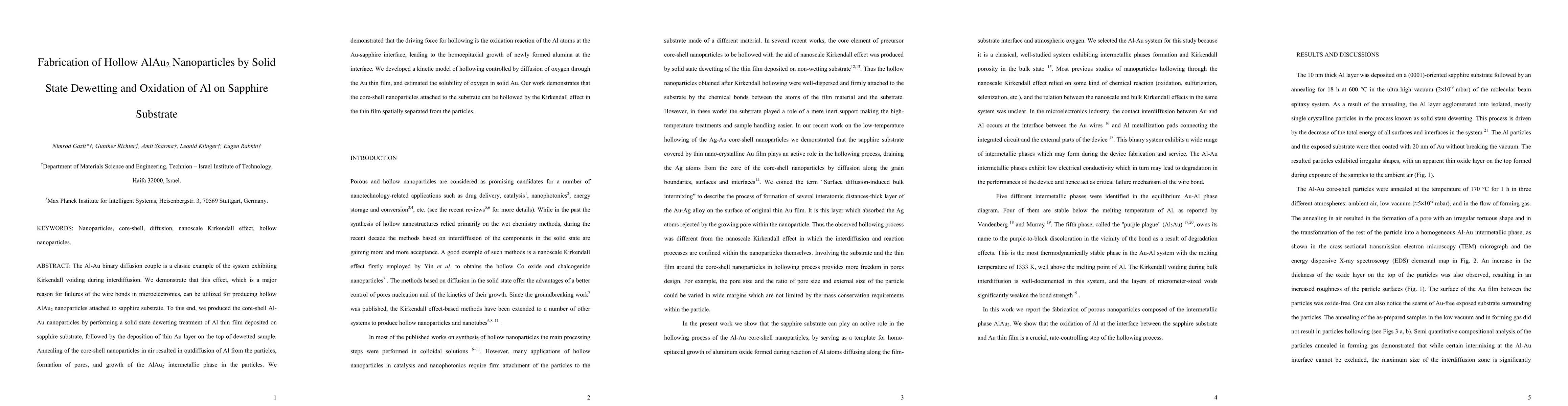 This paper details the fabrication of hollow AlAu2 nanoparticles via solid state dewetting and oxidation of Al on a sapphire substrate, utilizing the Kirkendall effect to create hollow structures driven by the oxidation reaction of Al atoms, and presents a kinetic model for the diffusion-controlled hollowing process.