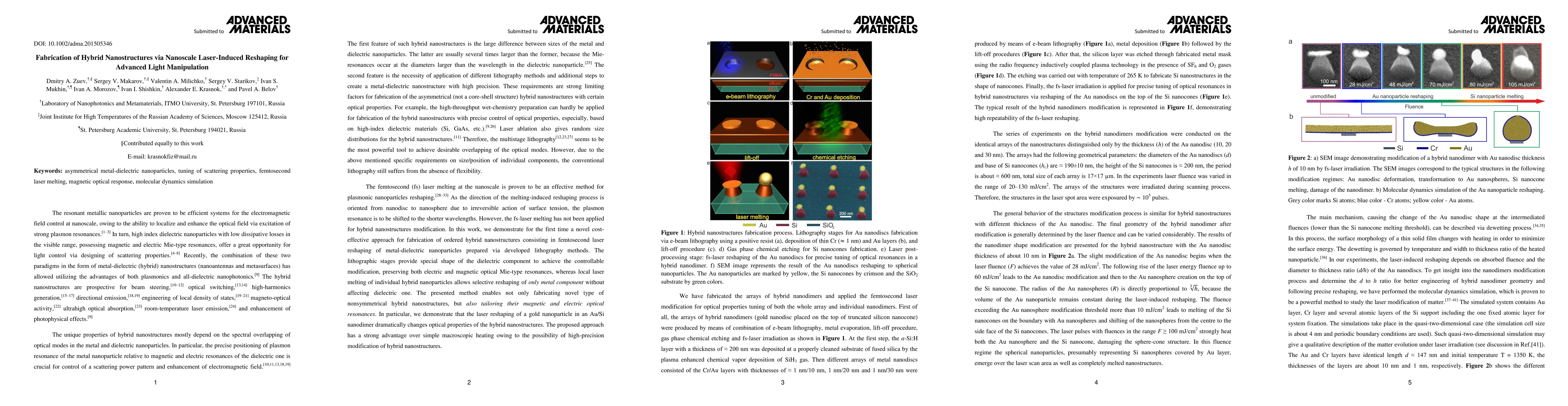 This paper presents a novel method for fabricating ordered hybrid metal-dielectric nanostructures using femtosecond laser reshaping, which selectively modifies the metal components without affecting the dielectric ones. The approach enables tuning of scattering properties in the visible range, supported by molecular dynamics simulation and computational electromagnetic modeling.