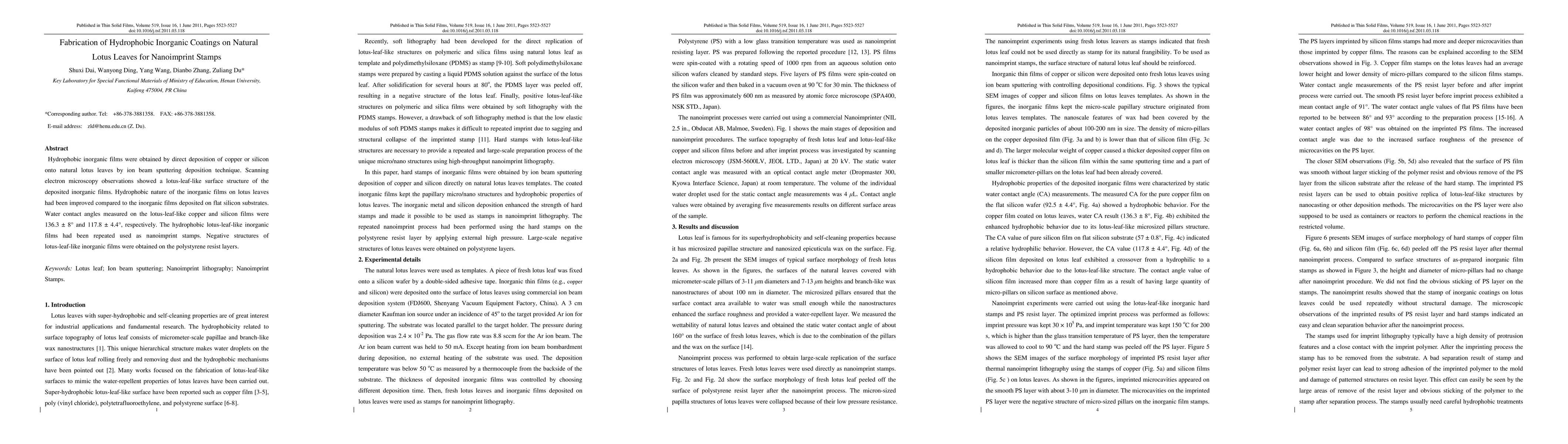 This paper details the fabrication of hydrophobic inorganic coatings on natural lotus leaves using ion beam sputtering, resulting in lotus-leaf-like surface structures that exhibit enhanced hydrophobicity. The deposited copper and silicon films served as nanoimprint stamps, demonstrating successful replication of negative structures on polystyrene resist layers.