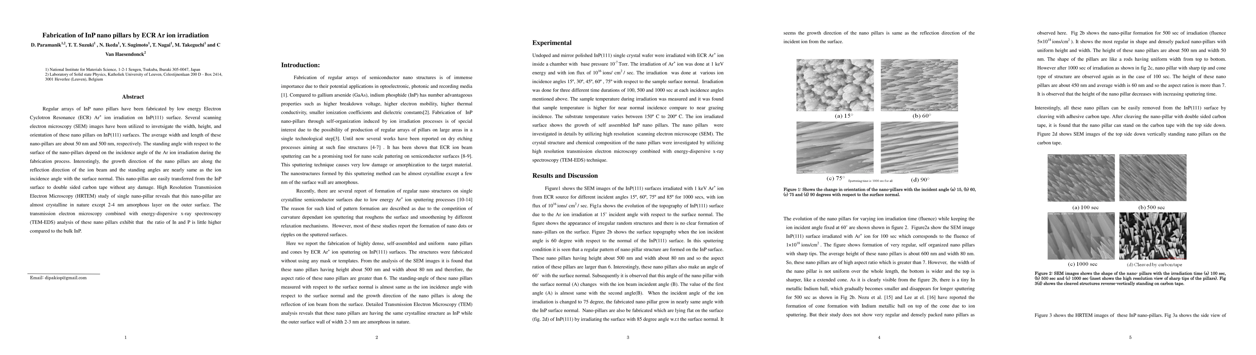 Regular arrays of InP nano pillars have been fabricated by low energy Electron Cyclotron Resonance (ECR) Ar+ ion irradiation on InP(111) surface. Several scanning electron microscopy (SEM) images have been utilized to invetsigate the width, height, and orientation of these nano pillars on InP(111) surfaces. The average width and length of these nano-pillars are about 50 nm and 500 nm, respectively. The standing angle with respect to the surface of the nano-pillars depend on the incidence angle of the Ar ion irradiation during the fabrication process. Interestingly, the growth direction of the nano pillars are along the reflection direction of the ion beam and the standing angles are nearly same as the ion incidence angle with the surface normal. This nano-pillas are easily transferred from the InP surface to double sided carbon tape without any damage. High Resolution Transmission Electron Microscopy (HRTEM) study of single nano-pillar reveals that this nano-pillar are almost crystalline in nature except 2-4 nm amorphous layer on the outer surface. The transmission electron microscopy combined with energy-dispersive x-ray spectroscopy (TEM-EDS) analysis of these nano pillars exhibit that the ratio of In and P is little higher compared to the bulk InP.