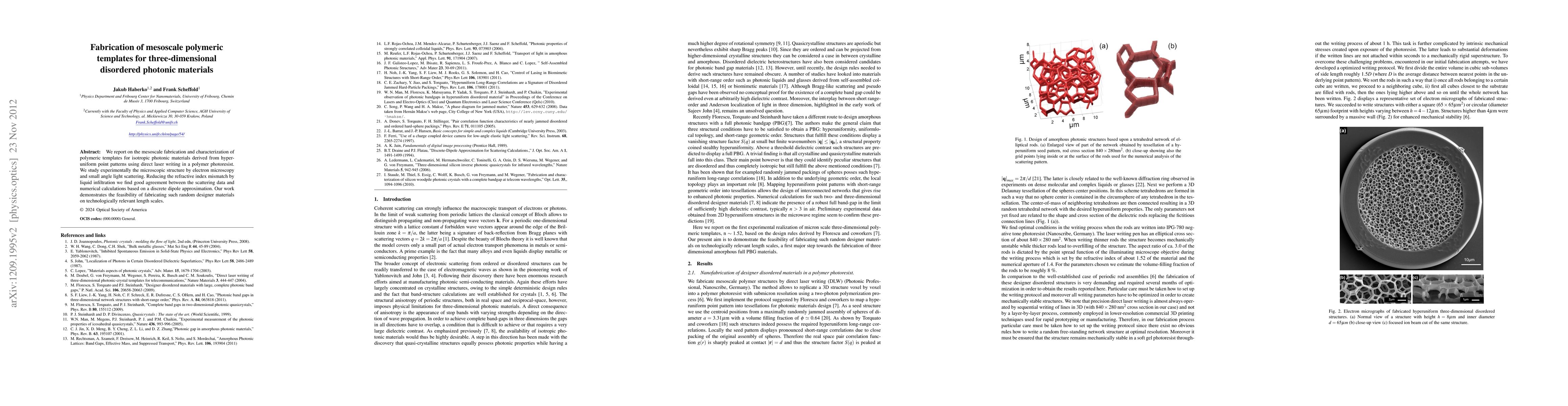 This paper details the fabrication of mesoscale polymeric templates for three-dimensional disordered photonic materials using direct laser writing, and validates the structure through electron microscopy and small angle light scattering, showing good agreement with numerical simulations. The study demonstrates the potential for creating such random materials on relevant technological scales.