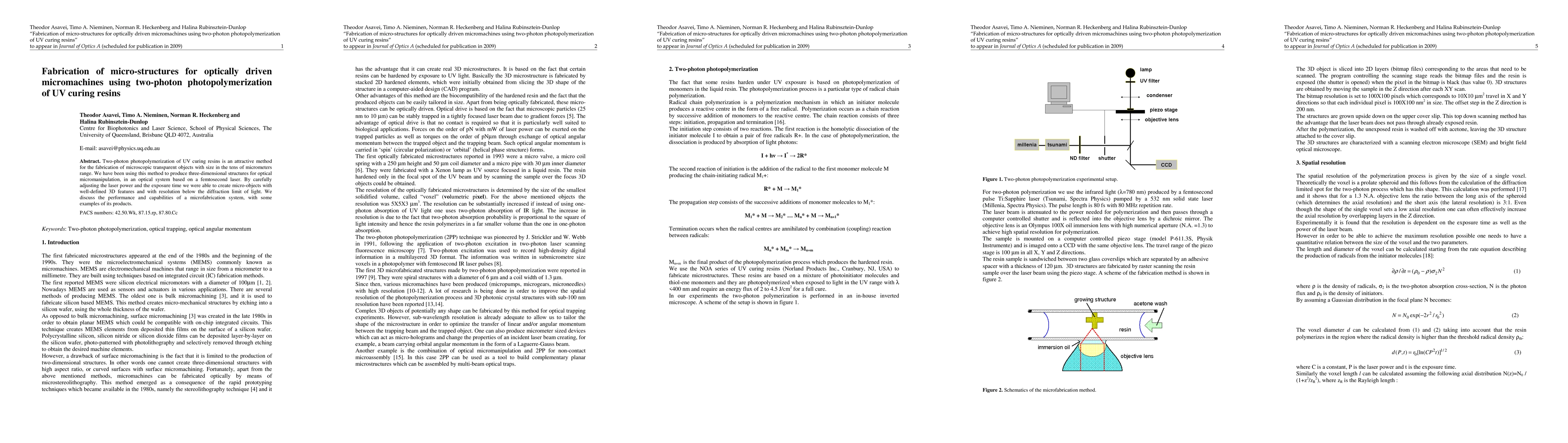 This paper details a method using two-photon photopolymerization to create microscopic 3D structures with features smaller than light's diffraction limit, for use in optical micromanipulation. The process involves a femtosecond laser and precise adjustments of power and exposure time, demonstrating the system's capability with examples of its outputs.