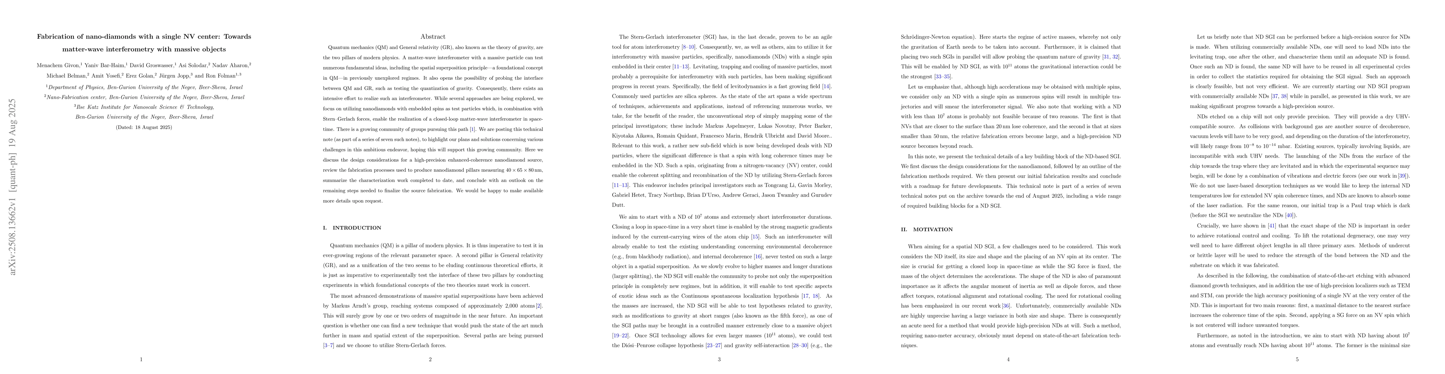 The paper presents detailed fabrication methods and considerations for high-precision nanodiamond pillars with embedded NV centers, crucial for matter-wave interferometry experiments.