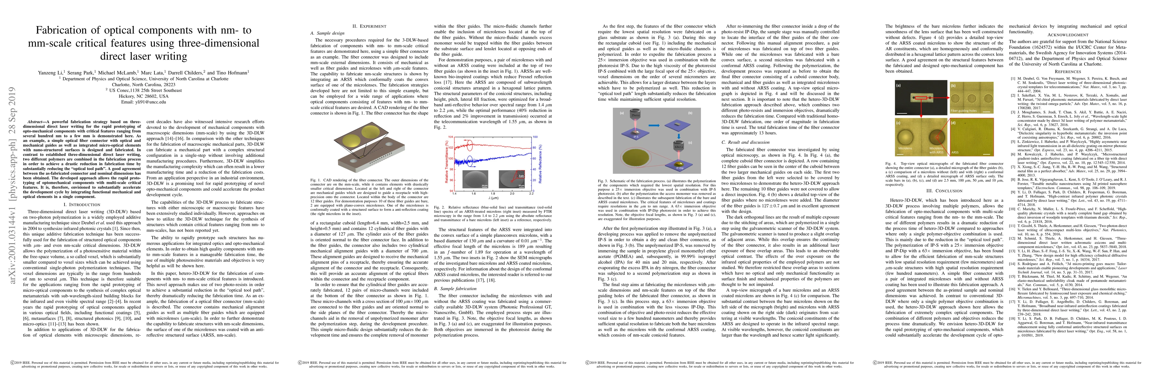 A powerful fabrication strategy based on three-dimensional direct laser writing for the rapid prototyping of opto-mechanical components with critical features ranging from several hundred nm to a few mm is demonstrated here. As an example, a simple optical fiber connector with optical and mechanical guides as well as integrated micro-optical elements with nano-structured surfaces is designed and fabricated. In contrast to established three-dimensional direct laser writing, two different polymers are combined in the fabrication process in order to achieve a drastic reduction in fabrication time by substantially reducing the "optical tool path". A good agreement between the as-fabricated connector and nominal dimensions has been obtained. The developed approach allows the rapid prototyping of optomechanical components with multi-scale critical features. It is, therefore, envisioned to substantially accelerate the development cycle by integrating functional mechanical and optical elements in a single component.
