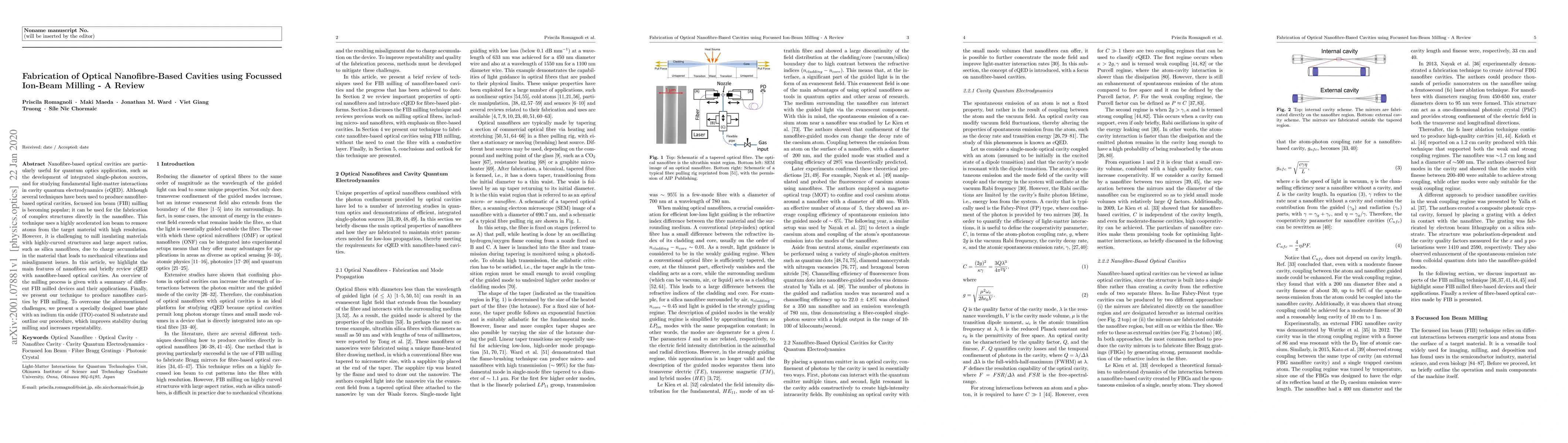 This review discusses the fabrication of optical nanofibre-based cavities using focused ion beam milling, highlighting its application in quantum optics and cQED. The paper presents a novel technique involving an ITO-coated Si substrate to enhance stability and repeatability during milling, addressing challenges with insulating materials.
