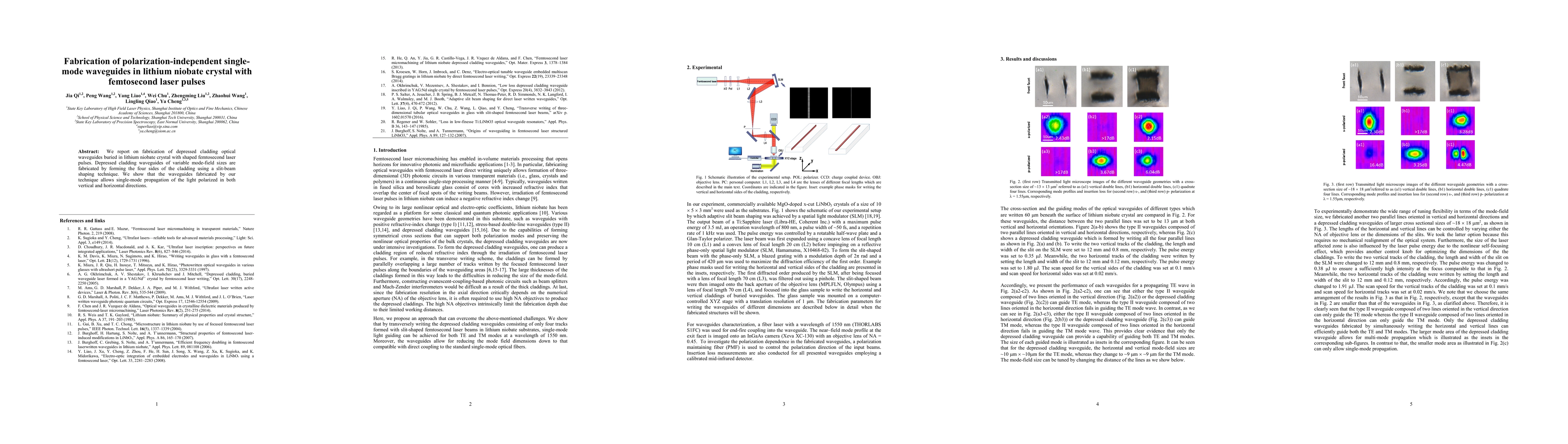 This paper details the fabrication of polarization-independent single-mode waveguides in lithium niobate using femtosecond laser pulses. The technique employs slit-beam shaping to create variable mode-field sizes, enabling single-mode light propagation regardless of polarization.