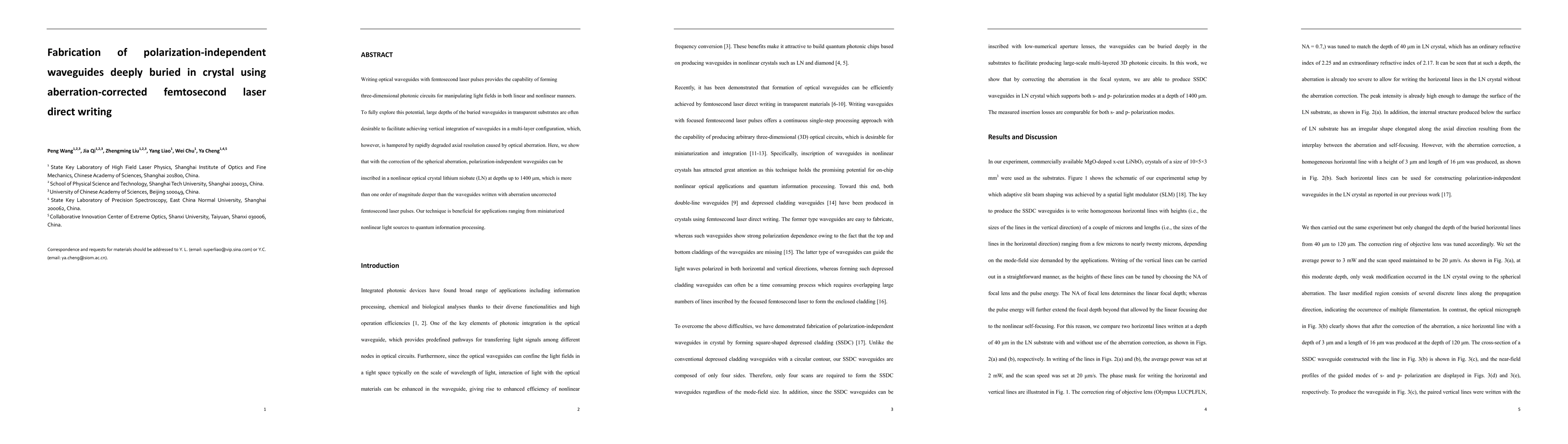 This paper demonstrates the fabrication of polarization-independent waveguides in lithium niobate crystal using aberration-corrected femtosecond laser direct writing, achieving depths of up to 1.4 mm—significantly deeper than conventional methods—thus enabling advanced three-dimensional photonic circuits.