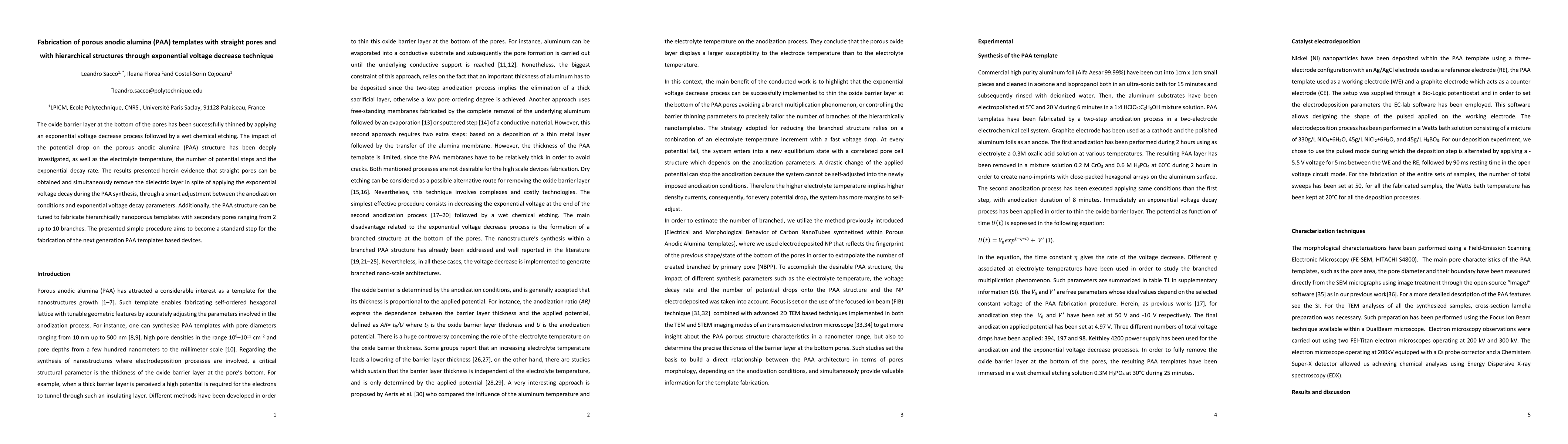 This paper details the fabrication of porous anodic alumina (PAA) templates with straight pores and hierarchical structures using an exponential voltage decrease technique. The study investigates the effects of voltage drop, electrolyte temperature, and decay rate to achieve precise control over the PAA structure, enabling the removal of the oxide barrier layer and the creation of hierarchically nanoporous templates.