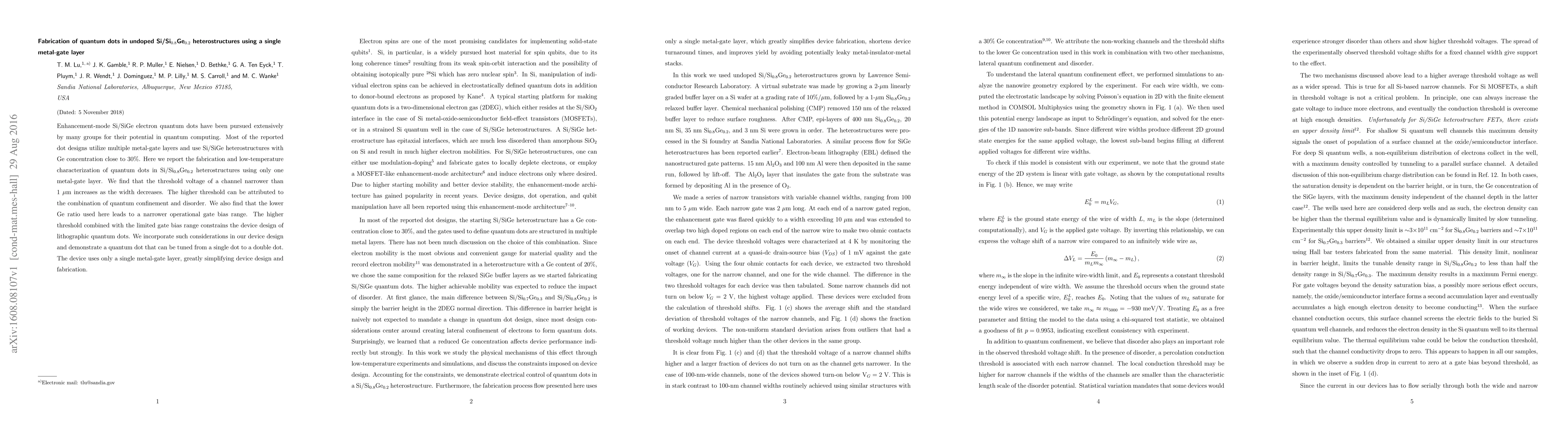 This paper reports the fabrication of quantum dots in Si/Si$_{0.8}$Ge$_{0.2}$ heterostructures using a single metal-gate layer, finding that the threshold voltage increases with decreasing channel width due to quantum confinement and disorder, and demonstrating a device that can transition from a single to a double quantum dot.