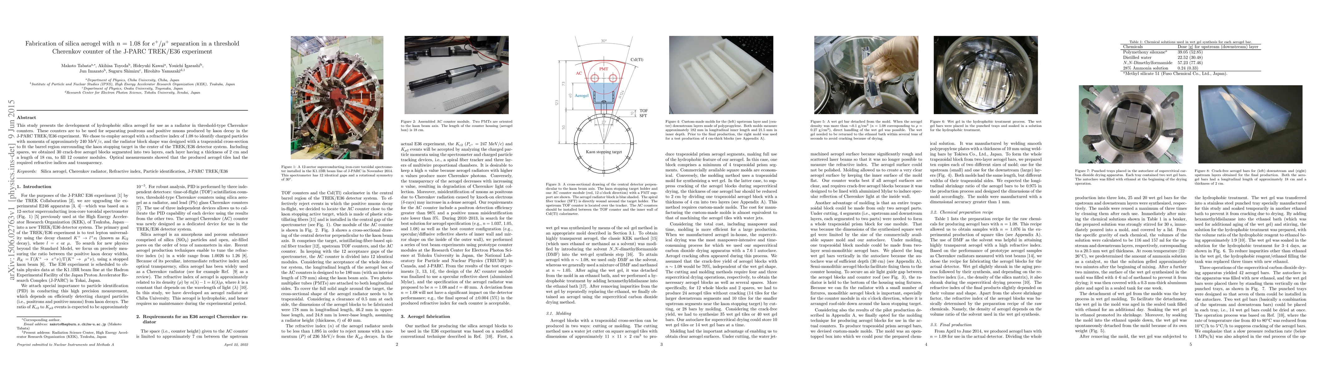This study developed hydrophobic silica aerogel with a refractive index of 1.08 for use as a radiator in Cherenkov counters to separate positrons and positive muons in the J-PARC TREK/E36 experiment. The aerogel blocks, designed with a trapezoidal shape, were crack-free and met optical requirements.