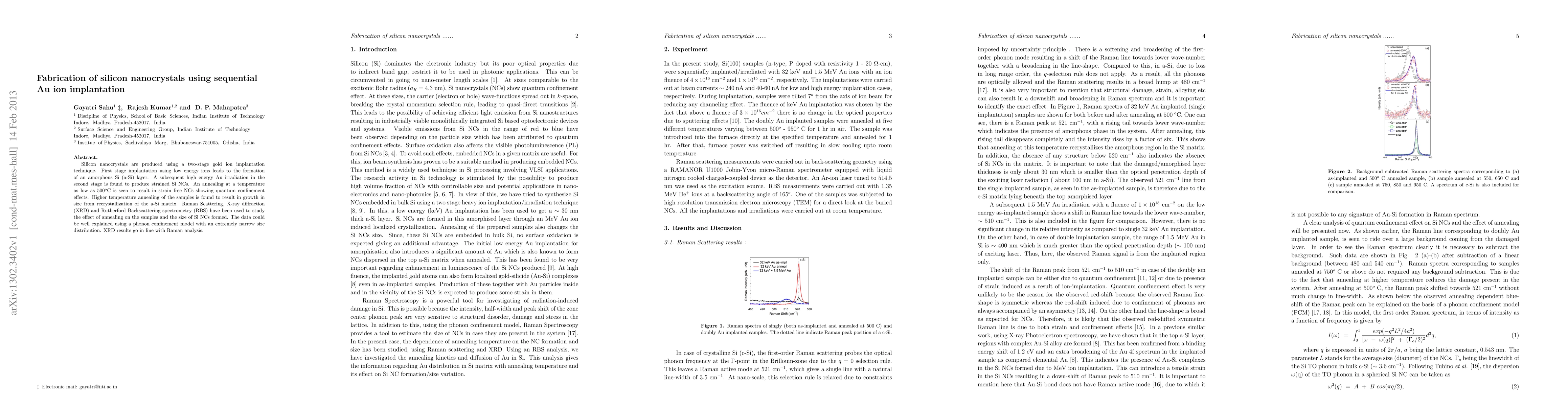 Silicon nanocrystals are produced using a two-stage gold ion implantation technique. First stage implantation using low energy ions leads to the formation of an amorphous Si (a-Si) layer. A subsequent high energy Au irradiation in the second stage is found to produce strained Si NCs. An annealing at a temperature as low as 500$^o$C is seen to result in strain free NCs showing quantum confinement effects. Higher temperature annealing of the samples is found to result in growth in size from recrystallization of the a-Si matrix. Raman Scattering, X-ray diffraction (XRD) and Rutherford Backscattering spectrometry (RBS) have been used to study the effect of annealing on the samples and the size of Si NCs formed. The data could be well explained using a phonon confinement model with an extremely narrow size distribution. XRD results go in line with Raman analysis.