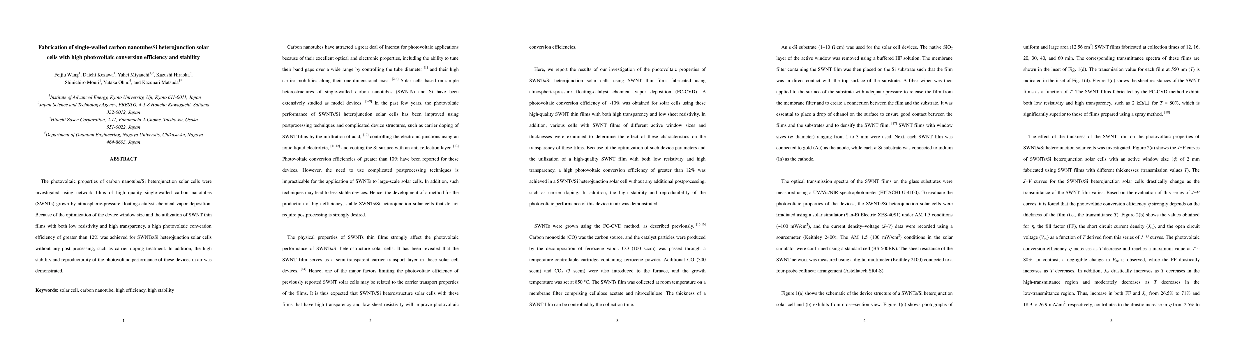 This paper investigates single-walled carbon nanotube/Si heterojunction solar cells, achieving over 12% photovoltaic conversion efficiency through optimized device design and high-quality SWNT films. The cells demonstrate excellent stability and reproducibility without post-processing treatments.