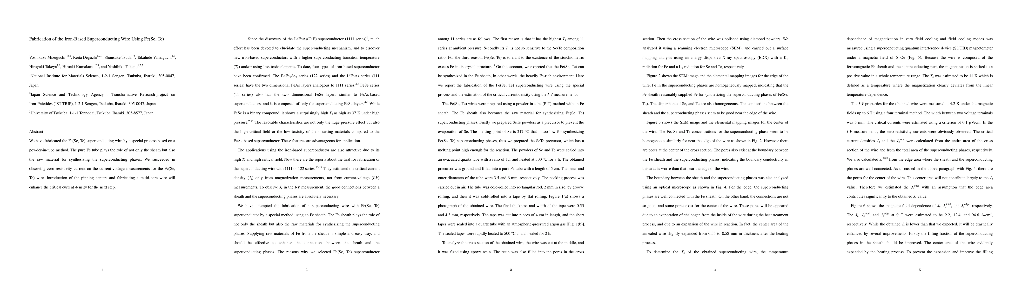 This paper details the fabrication of Fe(Se, Te) superconducting wire using a powder-in-tube method where pure Fe tube serves dual roles. The study reports successful zero resistivity current observations, suggesting potential for enhanced critical current density through pinning centers and multi-core wire fabrication.