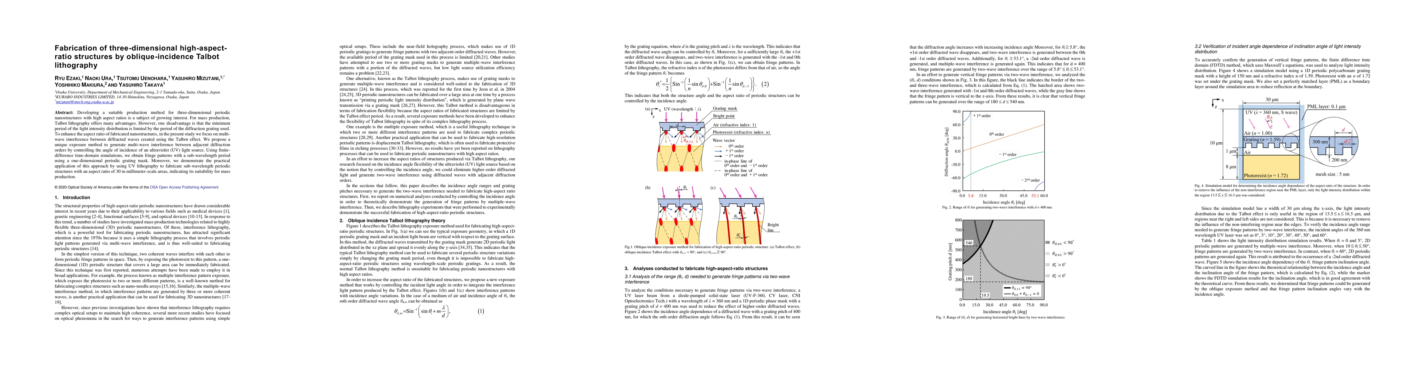 This paper proposes a novel oblique-incidence Talbot lithography method to fabricate three-dimensional high-aspect-ratio nanostructures by controlling the angle of incidence to generate multi-wave interference. The technique demonstrates the production of sub-wavelength periodic structures with an aspect ratio of 30, proving its potential for mass production.