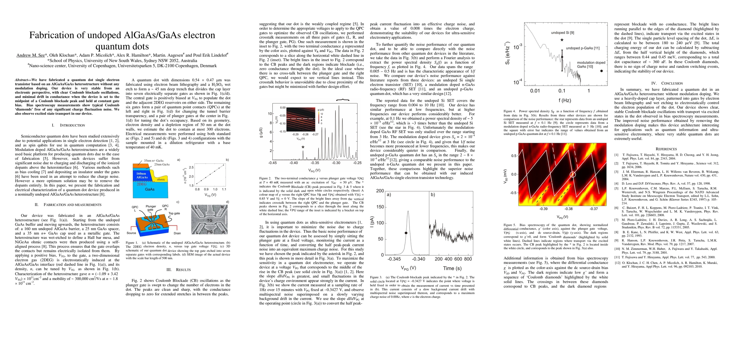 The paper presents a novel approach to fabricating quantum dots in an undoped AlGaAs/GaAs heterostructure, achieving reduced charge noise compared to modulation-doped devices.