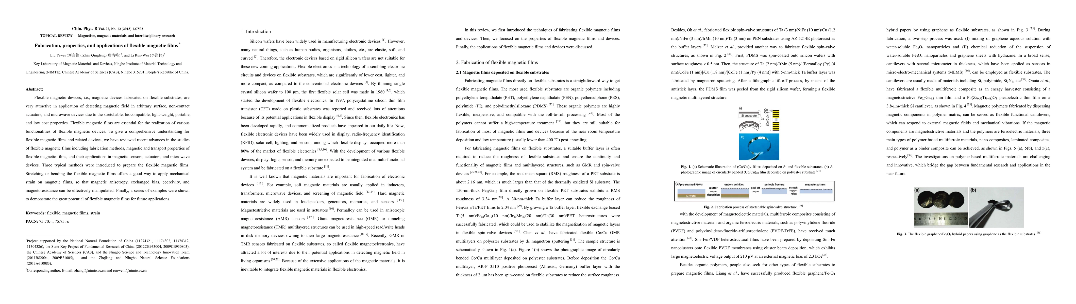 Flexible magnetic devices, i.e., magnetic devices fabricated on flexible substrates, are very attractive in application of detecting magnetic field in arbitrary surface, non-contact actuators, and microwave devices due to the stretchable, biocompatible, light-weight, portable, and low cost properties. Flexible magnetic films are essential for the realization of various functionalities of flexible magnetic devices. To give a comprehensive understanding for flexible magnetic films and related devices, we have reviewed recent advances in the studies of flexible magnetic films including fabrication methods, magnetic and transport properties of flexible magnetic films, and their applications in magnetic sensors, actuators, and microwave devices. Three typical methods were introduced to prepare the flexible magnetic films. Stretching or bending the flexible magnetic films offers a good way to apply mechanical strain on magnetic films, so that magnetic anisotropy, exchanged bias, coercivity, and magnetoresistance can be effectively manipulated. Finally, a series of examples were shown to demonstrate the great potential of flexible magnetic films for future applications.