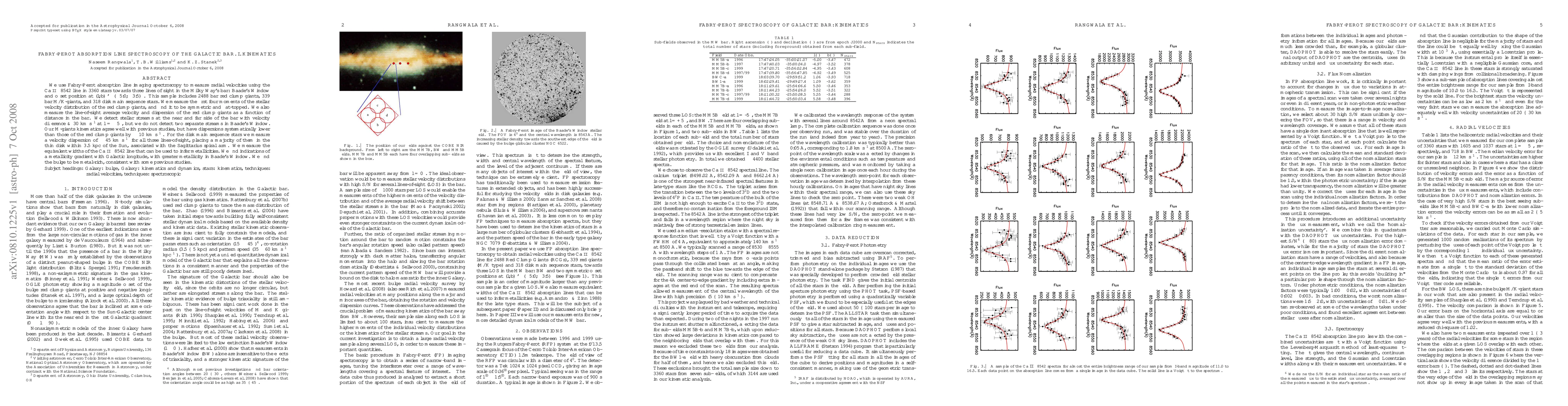 This study employs Fabry-Perot spectroscopy to measure radial velocities of 3360 stars in the Milky Way's bar, revealing symmetric and flat-topped velocity distributions for red clump giants and detecting stellar streams with velocity differences over 30 km/s. It also finds a metallicity gradient with Galactic longitude, indicating higher metallicity in Baade's Window.