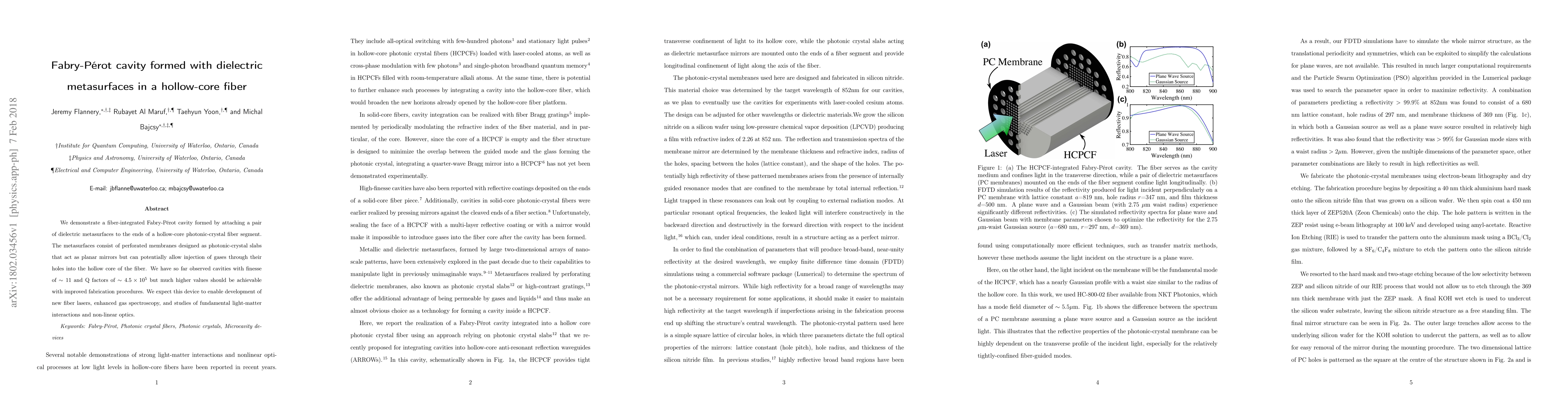The research demonstrates a fiber-integrated Fabry-Pérot cavity formed by attaching dielectric metasurfaces to the ends of a hollow-core photonic-crystal fiber segment. The metasurfaces are perforated membranes designed as photonic-crystal slabs, acting as planar mirrors with the potential for gas injection into the fiber core.