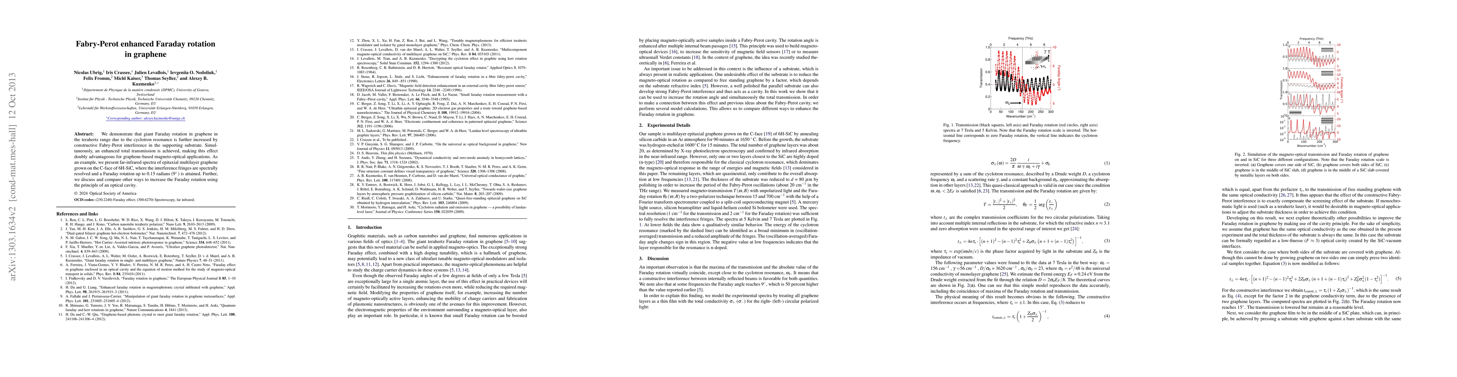 This paper demonstrates that enhancing Faraday rotation in graphene through cyclotron resonance is significantly amplified by constructive Fabry-Perot interference within the substrate, along with improved total transmission, which is beneficial for magneto-optical applications. An example showcases epitaxial multilayer graphene on 6H-SiC achieving a Faraday rotation of up to 0.15 radians.