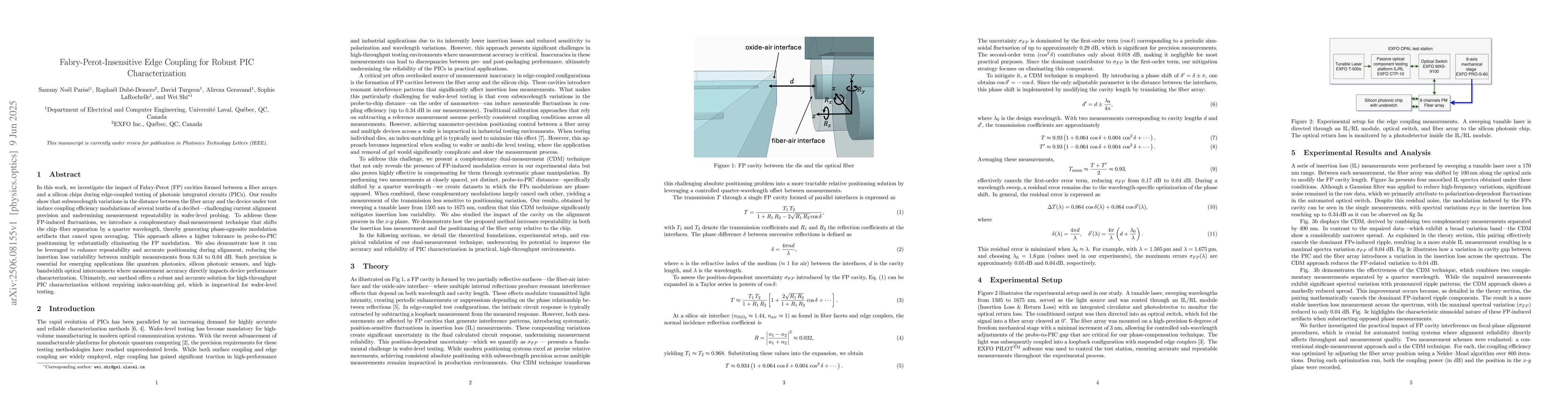 This research introduces a method to mitigate Fabry-Perot cavity effects in photonic integrated circuit (PIC) testing, improving measurement repeatability and reducing insertion loss variability. The technique involves a dual-measurement approach that cancels out FP-induced fluctuations, allowing for more precise alignment during wafer-level probing without the need for index-matching gel.