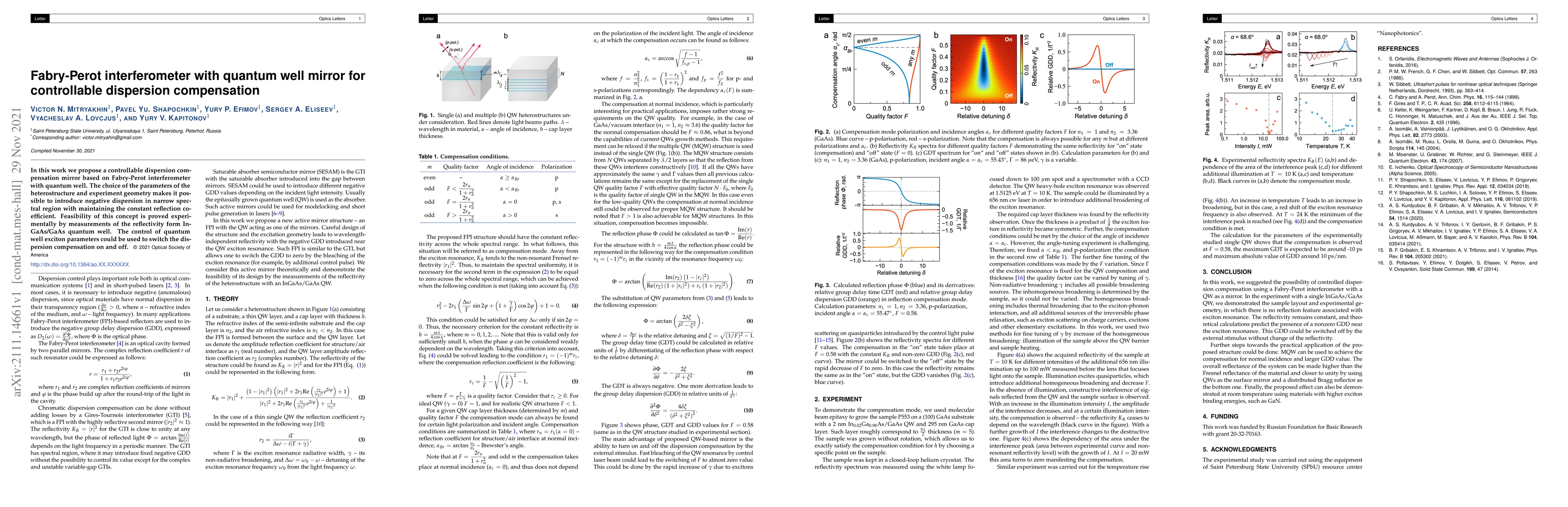 This paper proposes a Fabry-Perot interferometer with quantum well mirrors for tunable dispersion compensation, demonstrating negative dispersion in a narrow spectral region with consistent reflectivity. Experimental validation using InGaAs/GaAs quantum wells shows the feasibility of switching dispersion compensation on and off by controlling quantum well exciton parameters.