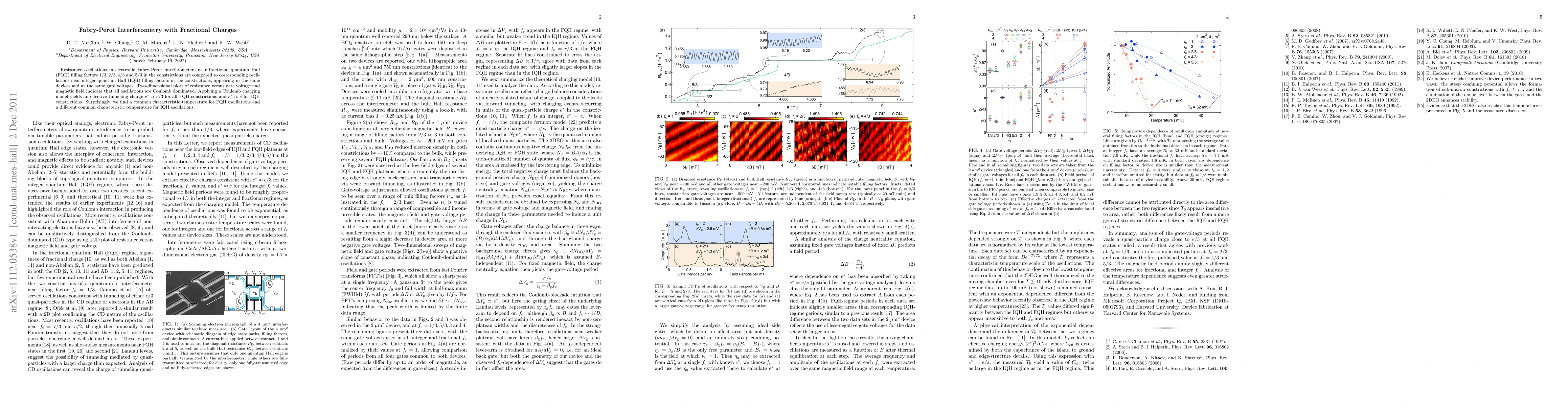 Resistance oscillations in electronic Fabry-Perot interferometers near fractional quantum Hall (FQH) filling factors 1/3, 2/3, 4/3 and 5/3 in the constrictions are compared to corresponding oscillations near integer quantum Hall (IQH) filling factors in the constrictions, appearing in the same devices and at the same gate voltages. Two-dimensional plots of resistance versus gate voltage and magnetic field indicate that all oscillations are Coulomb dominated. Applying a Coulomb charging model yields an effective tunneling charge e* \approx e/3 for all FQH constrictions and e* \approx e for IQH constrictions. Surprisingly, we find a common characteristic temperature for FQH oscillations and a different common characteristic temperature for IQH oscillations.