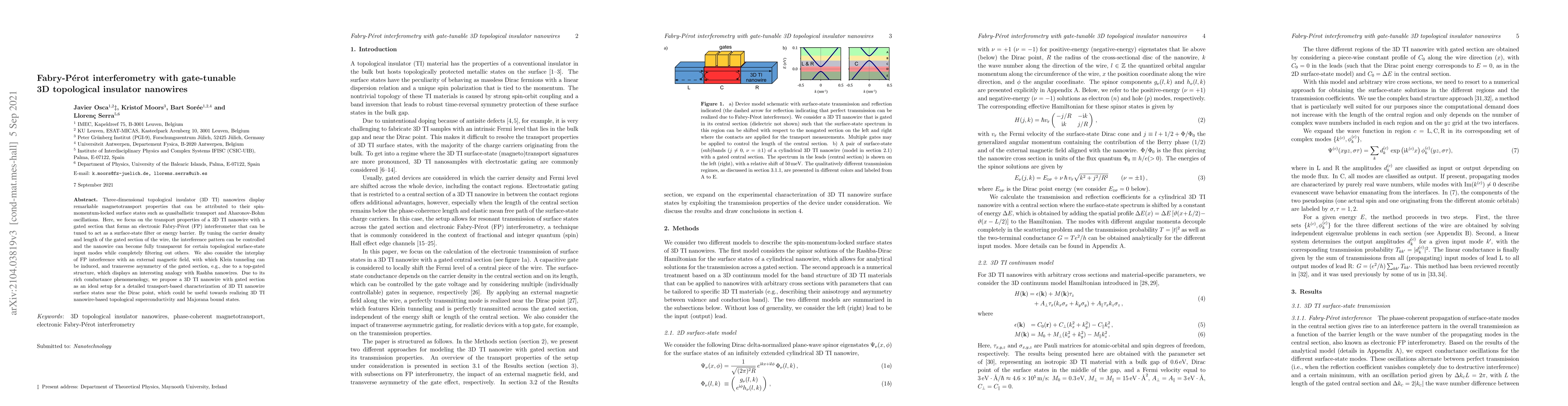 This paper investigates the magnetotransport properties of gated 3D topological insulator nanowires configured as a Fabry-Pérot interferometer, demonstrating tunable surface-state filtering and interference patterns. The study also explores the interplay with external magnetic fields and asymmetric gate structures, proposing the setup as a tool for characterizing topological surface states.