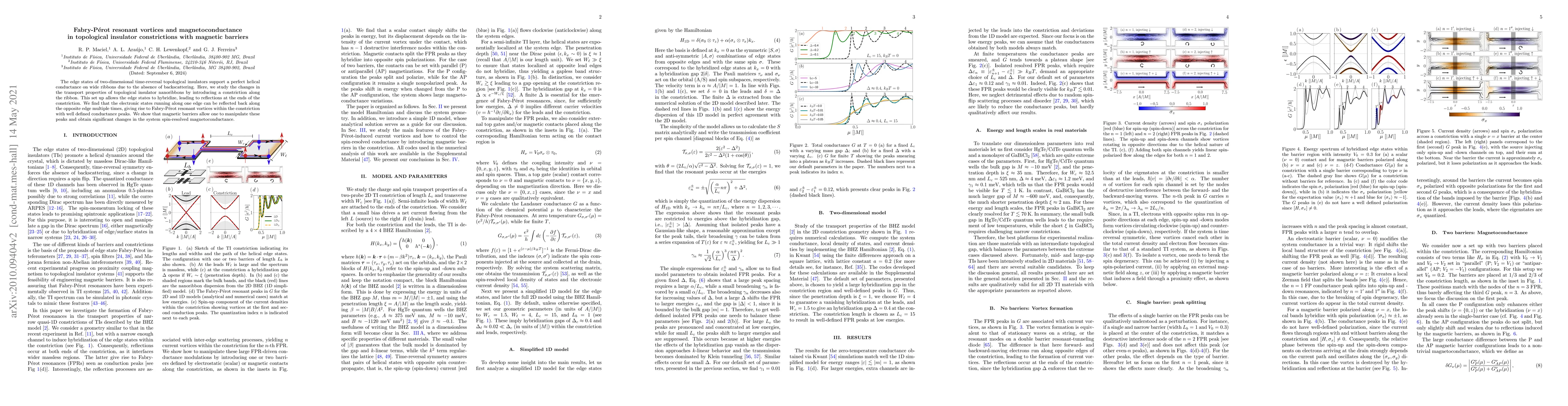 The edge states of two-dimensional time-reversal topological insulators support a perfect helical conductance on wide ribbons due to the absence of backscattering. Here, we study the changes in the transport properties of topological insulator nanoribbons by introducing a constriction along the ribbon. This setup allows the edge states to hybridize, leading to reflections at the ends of the constriction. We find that the electronic states running along one edge can be reflected back along the opposite edge multiple times, giving rise to Fabry-P\'erot resonant vortices within the constriction with well-defined conductance peaks. We show that magnetic barriers allow one to manipulate these peaks and obtain significant changes in the system spin-resolved magnetoconductance.
