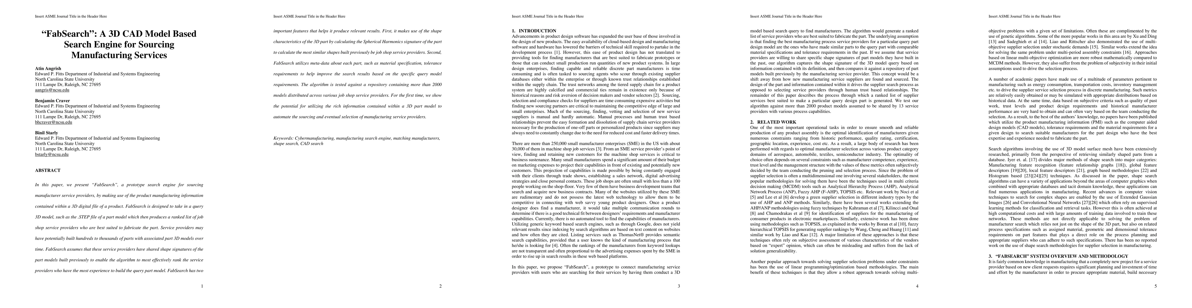 In this paper, we present "FabSearch", a prototype search engine for sourcing manufacturer service providers, by making use of the product manufacturing information contained within a 3D digital file of a product. FabSearch is designed to take in a query 3D model, such as the .STEP file of a part model which then produces a ranked list of job shop service providers who are best suited to fabricate the part. Service providers may have potentially built hundreds to thousands of parts with associated part 3D models over time. FabSearch assumes that these service providers have shared shape signatures of the part models built previously to enable the algorithm to most effectively rank the service providers who have the most experience to build the query part model. FabSearch has two important features that helps it produce relevant results. First, it makes use of the shape characteristics of the 3D part by calculating the Spherical Harmonics signature of the part to calculate the most similar shapes built previously be job shop service providers. Second, FabSearch utilizes meta-data about each part, such as material specification, tolerance requirements to help improve the search results based on the specific query model requirements. The algorithm is tested against a repository containing more than 2000 models distributed across various job shop service providers. For the first time, we show the potential for utilizing the rich information contained within a 3D part model to automate the sourcing and eventual selection of manufacturing service providers.