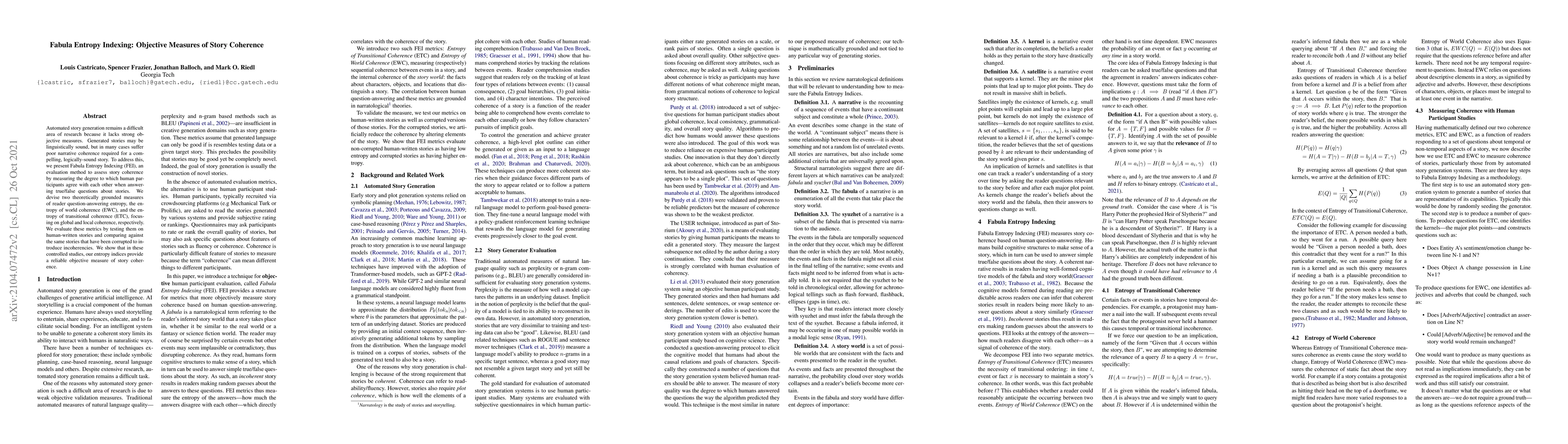 The Fabula Entropy Indexing (FEI) method introduces objective measures to evaluate story coherence by gauging human agreement on true/false questions. It employs entropy metrics, EWC and ETC, to assess global and local coherence, respectively, demonstrating reliability in distinguishing coherent from incoherent stories.