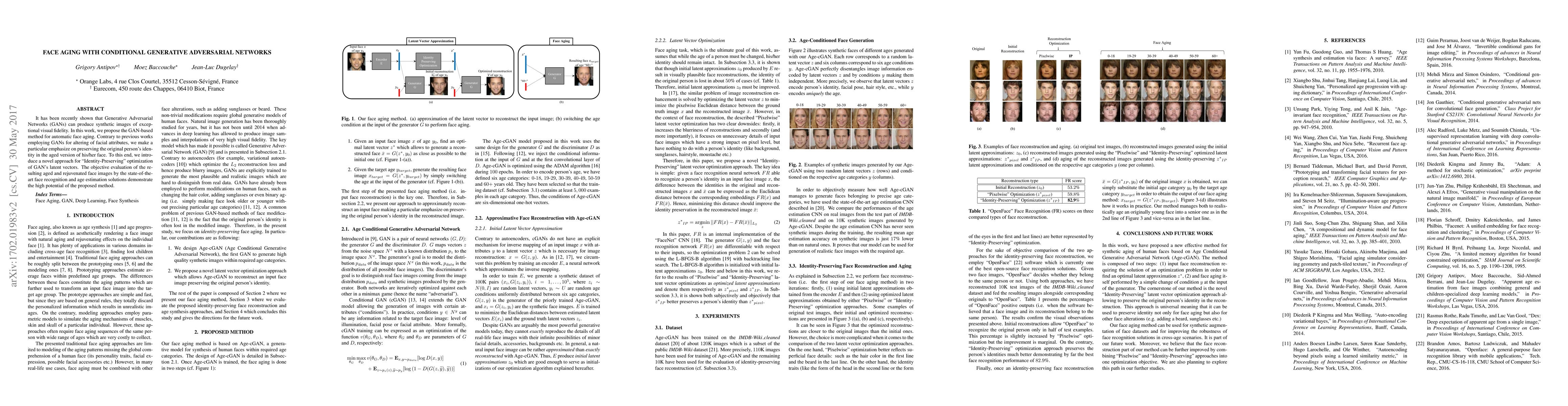 This paper proposes a GAN-based method for automatic face aging that emphasizes preserving the original person's identity in the aged version. It introduces an "Identity-Preserving" optimization of GAN's latent vectors, and evaluations show the method's high potential.