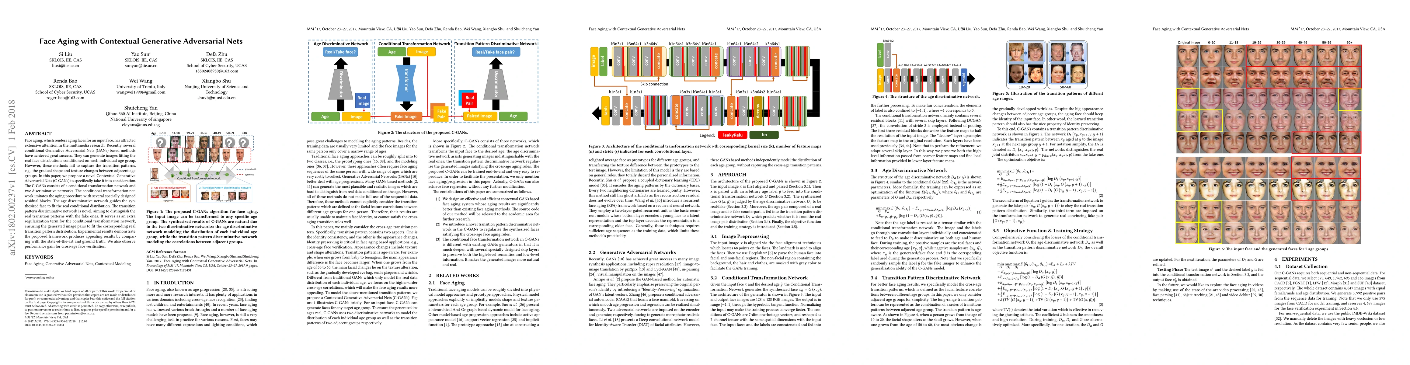 This paper proposes Contextual Generative Adversarial Nets (C-GANs) for face aging, addressing the limitation of existing methods in capturing gradual shape and texture changes between age groups. The framework includes a conditional transformation network and two discriminative networks to enhance realistic transition patterns and overall image quality.