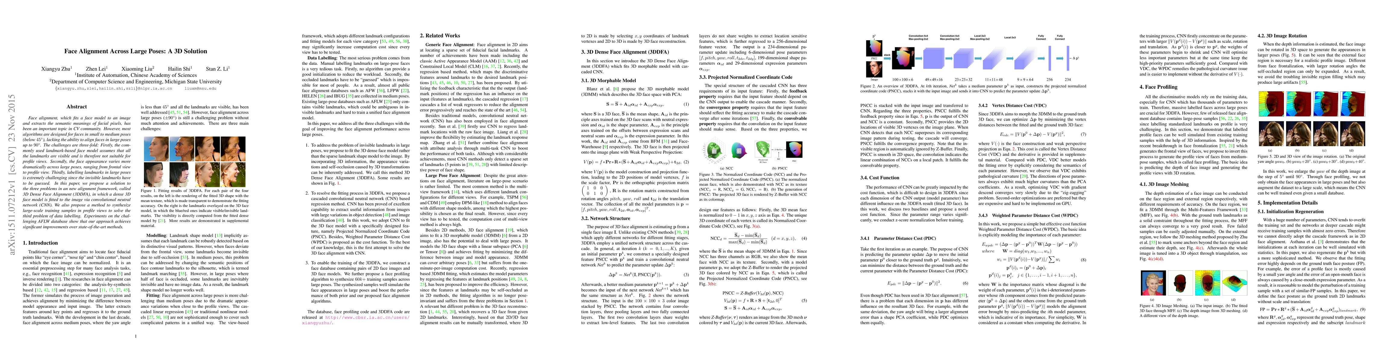 Face alignment, which fits a face model to an image and extracts the semantic meanings of facial pixels, has been an important topic in CV community. However, most algorithms are designed for faces in small to medium poses (below 45 degree), lacking the ability to align faces in large poses up to 90 degree. The challenges are three-fold: Firstly, the commonly used landmark-based face model assumes that all the landmarks are visible and is therefore not suitable for profile views. Secondly, the face appearance varies more dramatically across large poses, ranging from frontal view to profile view. Thirdly, labelling landmarks in large poses is extremely challenging since the invisible landmarks have to be guessed. In this paper, we propose a solution to the three problems in an new alignment framework, called 3D Dense Face Alignment (3DDFA), in which a dense 3D face model is fitted to the image via convolutional neutral network (CNN). We also propose a method to synthesize large-scale training samples in profile views to solve the third problem of data labelling. Experiments on the challenging AFLW database show that our approach achieves significant improvements over state-of-the-art methods.