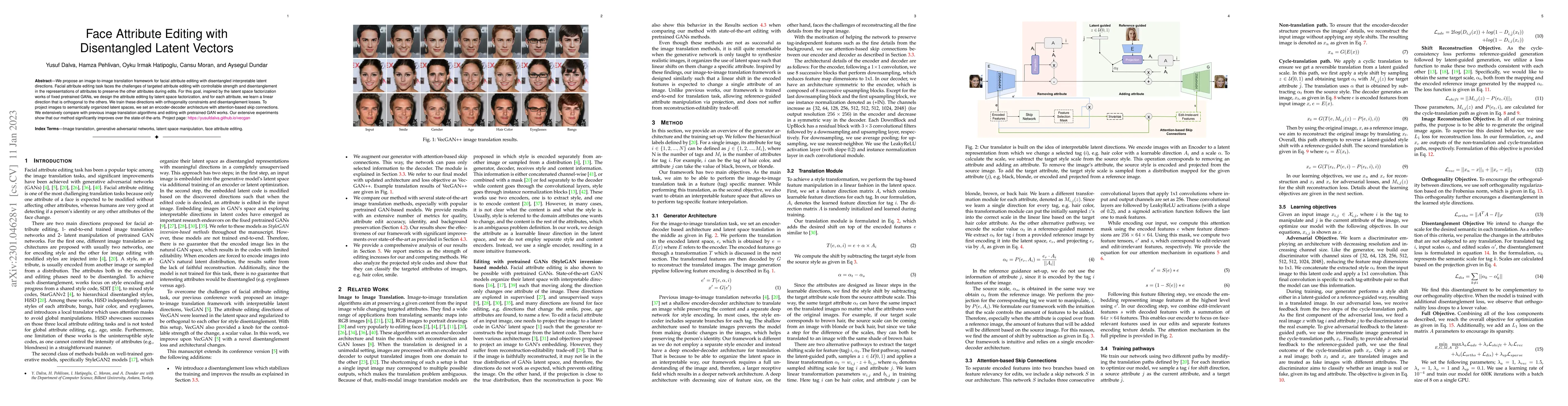 This paper introduces a framework for facial attribute editing using disentangled latent vectors, achieving targeted edits with controllable strength while preserving other attributes. The method employs orthogonal latent directions and an encoder-decoder architecture with attention-based skip connections, outperforming previous state-of-the-art algorithms in extensive experiments.