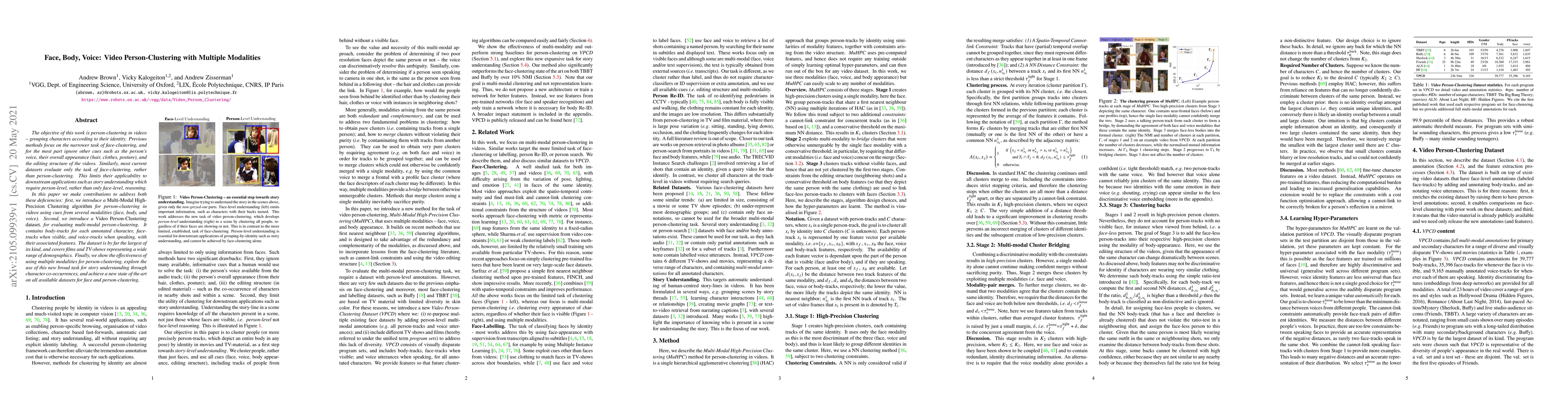 The objective of this work is person-clustering in videos -- grouping characters according to their identity. Previous methods focus on the narrower task of face-clustering, and for the most part ignore other cues such as the person's voice, their overall appearance (hair, clothes, posture), and the editing structure of the videos. Similarly, most current datasets evaluate only the task of face-clustering, rather than person-clustering. This limits their applicability to downstream applications such as story understanding which require person-level, rather than only face-level, reasoning. In this paper we make contributions to address both these deficiencies: first, we introduce a Multi-Modal High-Precision Clustering algorithm for person-clustering in videos using cues from several modalities (face, body, and voice). Second, we introduce a Video Person-Clustering dataset, for evaluating multi-modal person-clustering. It contains body-tracks for each annotated character, face-tracks when visible, and voice-tracks when speaking, with their associated features. The dataset is by far the largest of its kind, and covers films and TV-shows representing a wide range of demographics. Finally, we show the effectiveness of using multiple modalities for person-clustering, explore the use of this new broad task for story understanding through character co-occurrences, and achieve a new state of the art on all available datasets for face and person-clustering.
