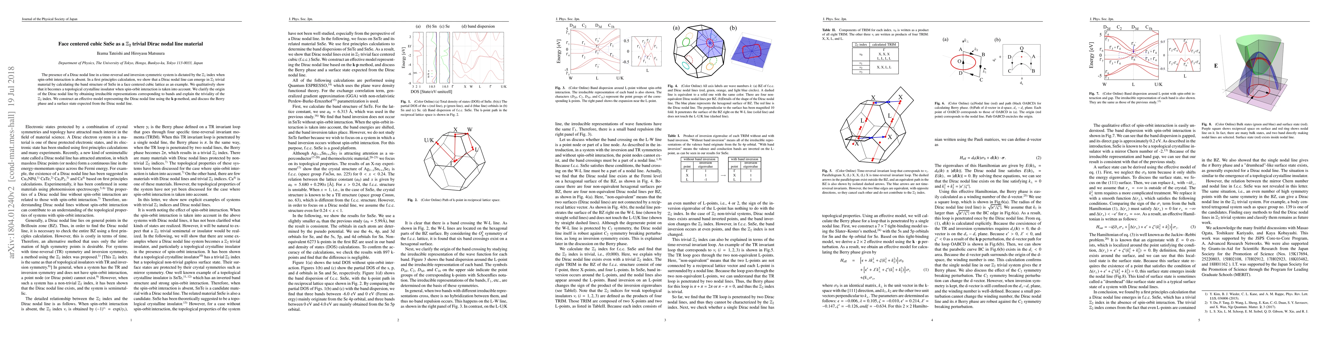This paper demonstrates the emergence of a Dirac nodal line in the $\mathbb{Z}_2$ trivial material SnSe with a face centered cubic lattice, revealing it becomes a topological crystalline insulator when spin-orbit interaction is included. It constructs an effective model to discuss the associated Berry phase and surface state.