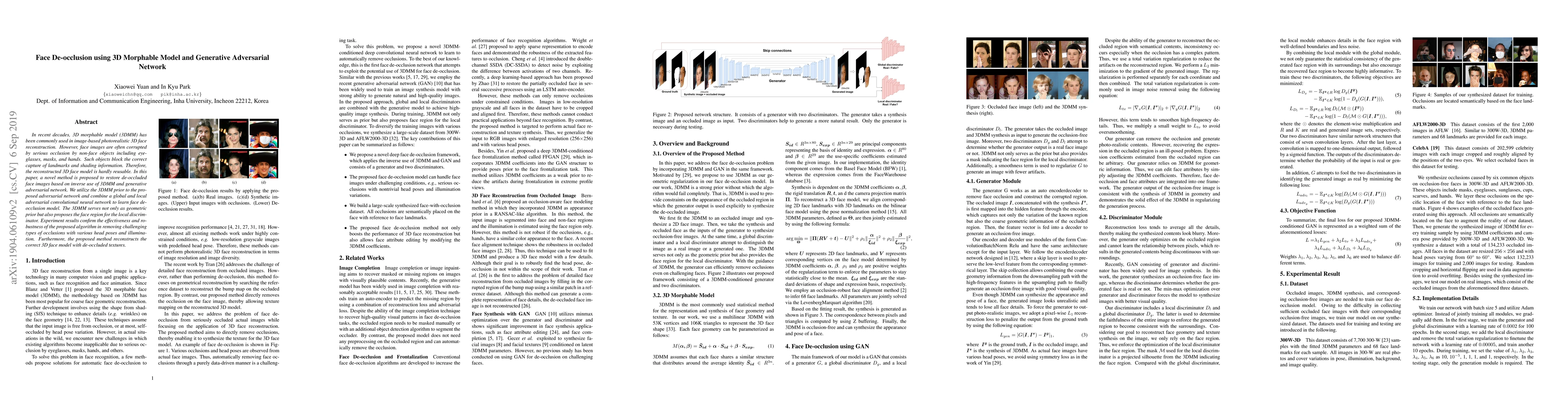 This paper proposes a novel method combining 3D Morphable Model (3DMM) and Generative Adversarial Network (GAN) to restore de-occluded face images, effectively removing occlusions like eyeglasses and masks. The method uses 3DMM as a geometric prior and integrates global and local adversarial networks to achieve robust face de-occlusion and accurate 3D face reconstruction.