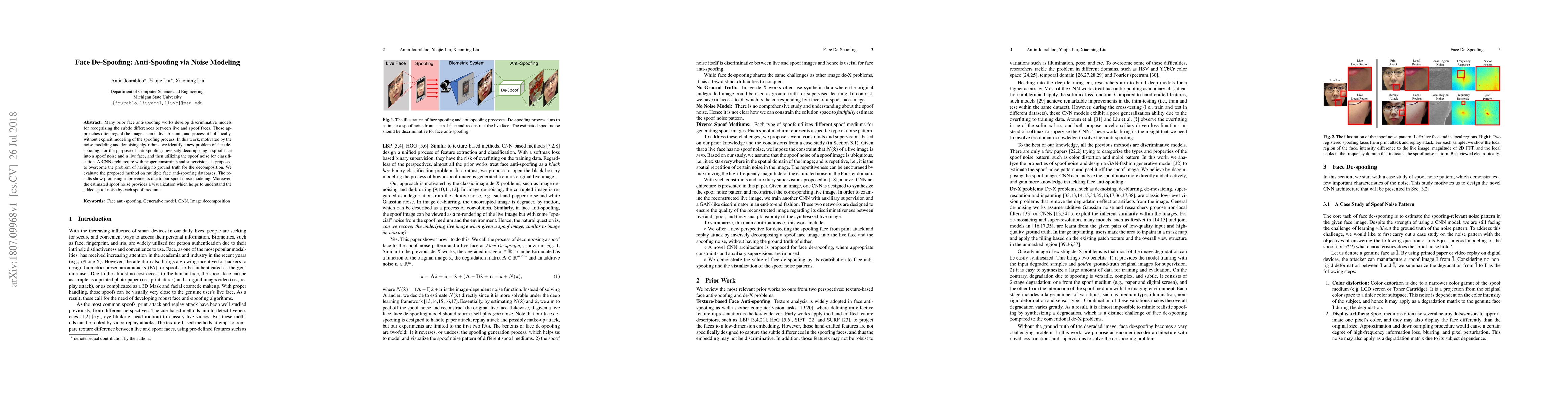 Many prior face anti-spoofing works develop discriminative models for recognizing the subtle differences between live and spoof faces. Those approaches often regard the image as an indivisible unit, and process it holistically, without explicit modeling of the spoofing process. In this work, motivated by the noise modeling and denoising algorithms, we identify a new problem of face de-spoofing, for the purpose of anti-spoofing: inversely decomposing a spoof face into a spoof noise and a live face, and then utilizing the spoof noise for classification. A CNN architecture with proper constraints and supervisions is proposed to overcome the problem of having no ground truth for the decomposition. We evaluate the proposed method on multiple face anti-spoofing databases. The results show promising improvements due to our spoof noise modeling. Moreover, the estimated spoof noise provides a visualization which helps to understand the added spoof noise by each spoof medium.