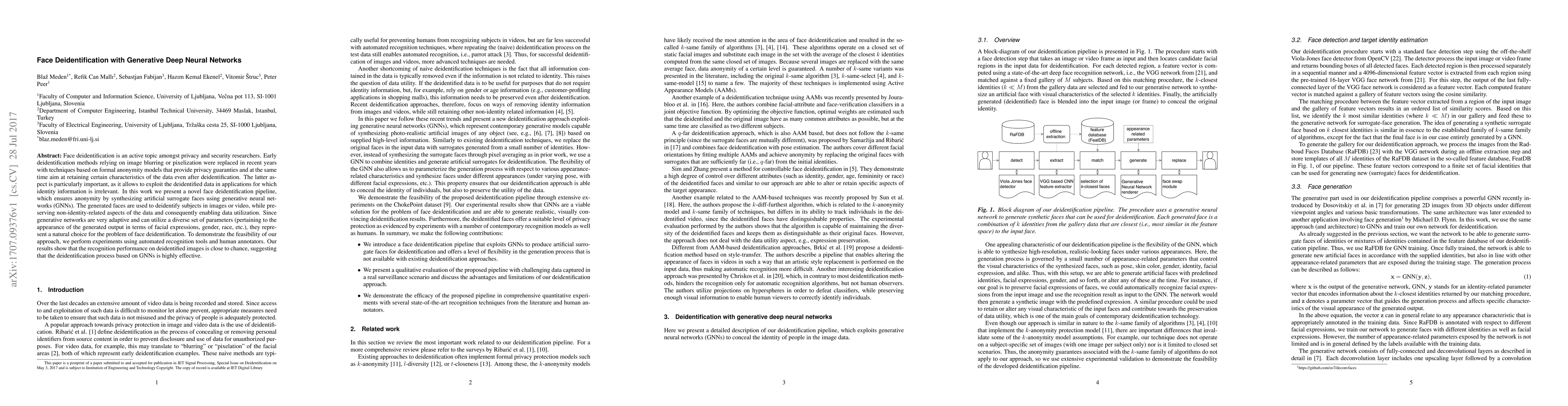 A new face deidentification method uses generative neural networks to create artificial surrogate faces that preserve non-identity characteristics while anonymizing individuals in images or video. The approach achieves high effectiveness, making it difficult for recognition tools to identify the original subjects.