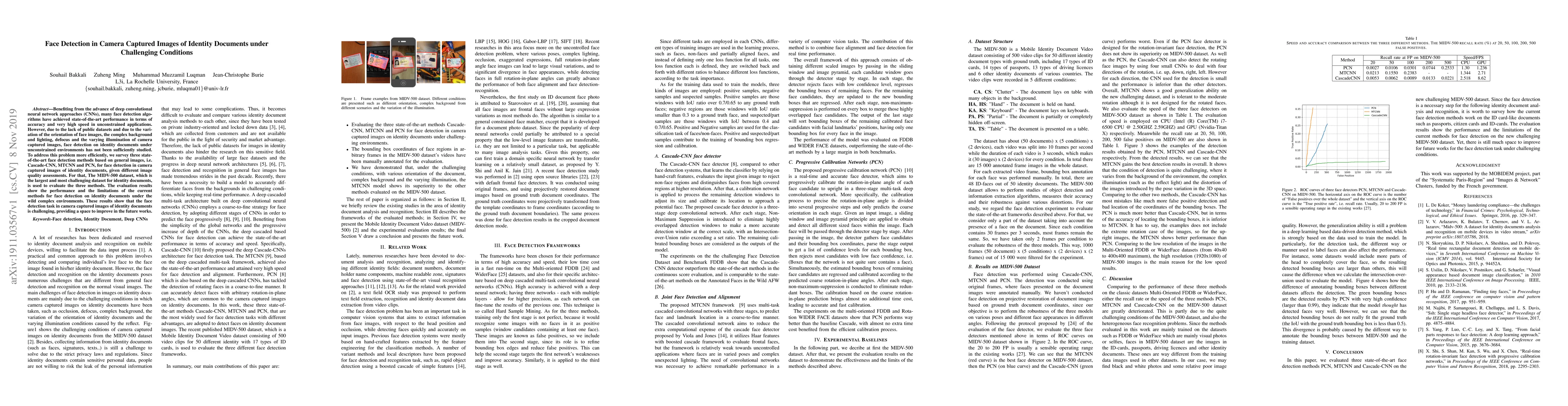 This paper surveys three advanced CNN-based face detection methods—Cascade-CNN, MTCNN, and PCN—for detecting faces in camera-captured identity documents under challenging conditions. The MIDV-500 dataset is used to evaluate these methods, revealing their performance and limitations in complex environments.