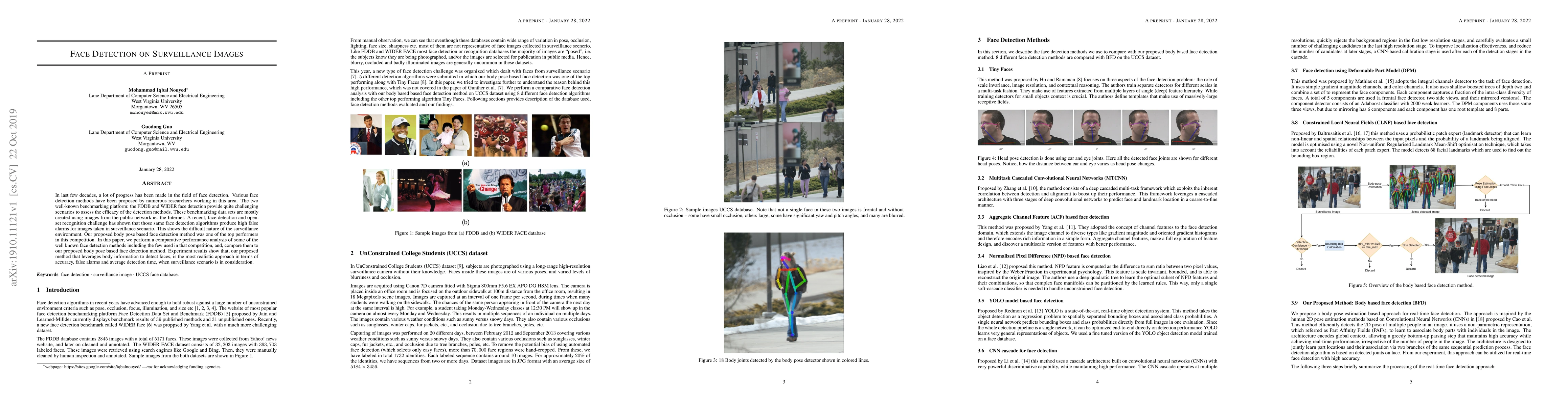 This paper proposes a body pose-based face detection method that outperforms traditional techniques in surveillance scenarios, demonstrating higher accuracy and lower false alarms compared to other methods, as shown through comparative performance analysis.