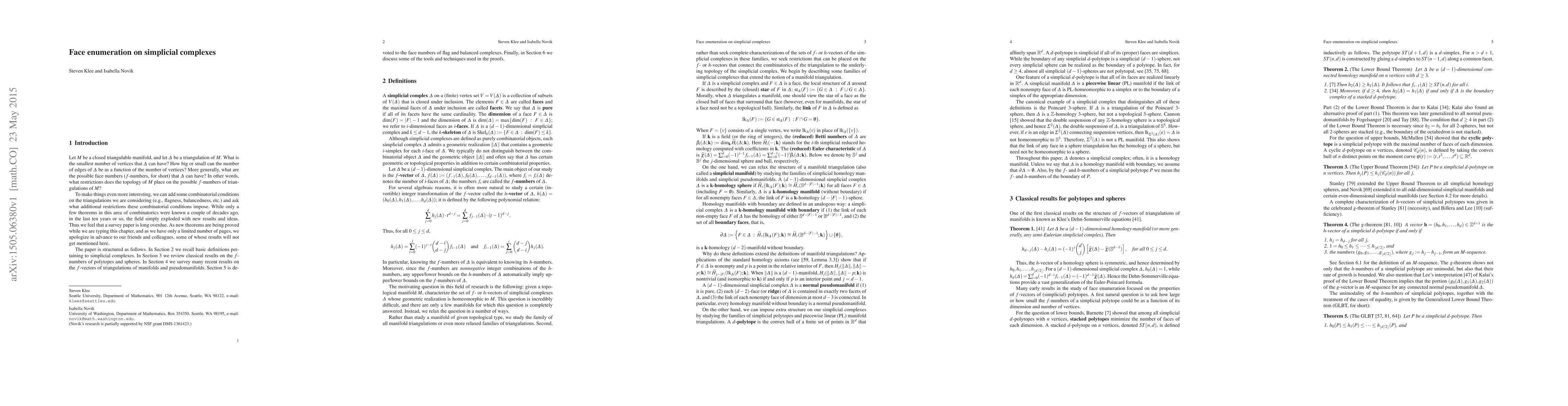 Let $M$ be a closed triangulable manifold, and let $\Delta$ be a triangulation of $M$. What is the smallest number of vertices that $\Delta$ can have? How big or small can the number of edges of $\Delta$ be as a function of the number of vertices? More generally, what are the possible face numbers ($f$-numbers, for short) that $\Delta$ can have? In other words, what restrictions does the topology of $M$ place on the possible $f$-numbers of triangulations of $M$? To make things even more interesting, we can add some combinatorial conditions on the triangulations we are considering (e.g., flagness, balancedness, etc.) and ask what additional restrictions these combinatorial conditions impose. While only a few theorems in this area of combinatorics were known a couple of decades ago, in the last ten years or so, the field simply exploded with new results and ideas. Thus we feel that a survey paper is long overdue. As new theorems are being proved while we are typing this chapter, and as we have only a limited number of pages, we apologize in advance to our friends and colleagues, some of whose results will not get mentioned here.