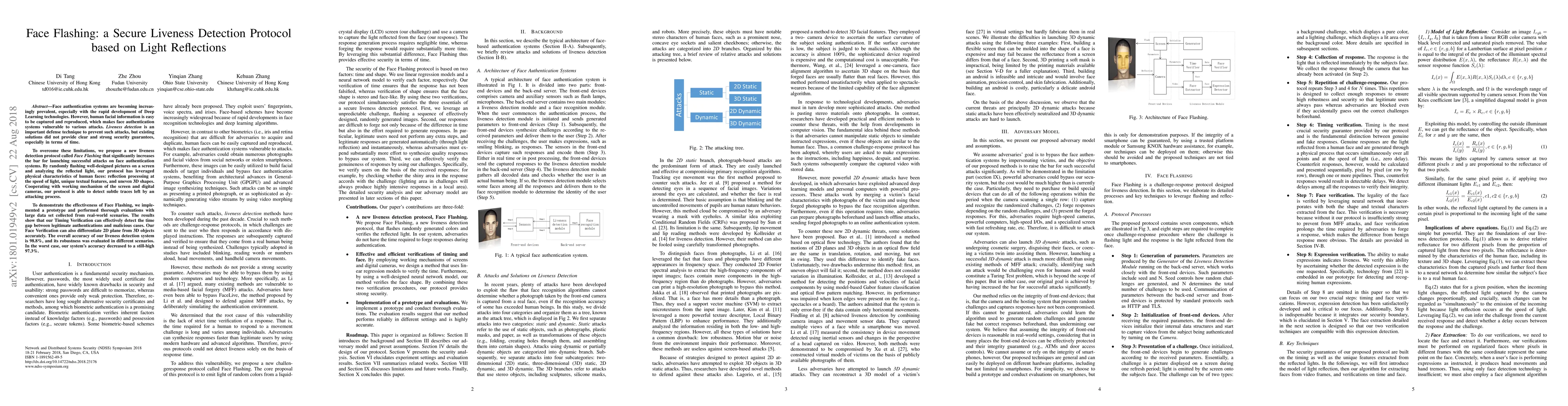 Face authentication systems are becoming increasingly prevalent, especially with the rapid development of Deep Learning technologies. However, human facial information is easy to be captured and reproduced, which makes face authentication systems vulnerable to various attacks. Liveness detection is an important defense technique to prevent such attacks, but existing solutions did not provide clear and strong security guarantees, especially in terms of time. To overcome these limitations, we propose a new liveness detection protocol called Face Flashing that significantly increases the bar for launching successful attacks on face authentication systems. By randomly flashing well-designed pictures on a screen and analyzing the reflected light, our protocol has leveraged physical characteristics of human faces: reflection processing at the speed of light, unique textual features, and uneven 3D shapes. Cooperating with working mechanism of the screen and digital cameras, our protocol is able to detect subtle traces left by an attacking process. To demonstrate the effectiveness of Face Flashing, we implemented a prototype and performed thorough evaluations with large data set collected from real-world scenarios. The results show that our Timing Verification can effectively detect the time gap between legitimate authentications and malicious cases. Our Face Verification can also differentiate 2D plane from 3D objects accurately. The overall accuracy of our liveness detection system is 98.8\%, and its robustness was evaluated in different scenarios. In the worst case, our system's accuracy decreased to a still-high 97.3\%.